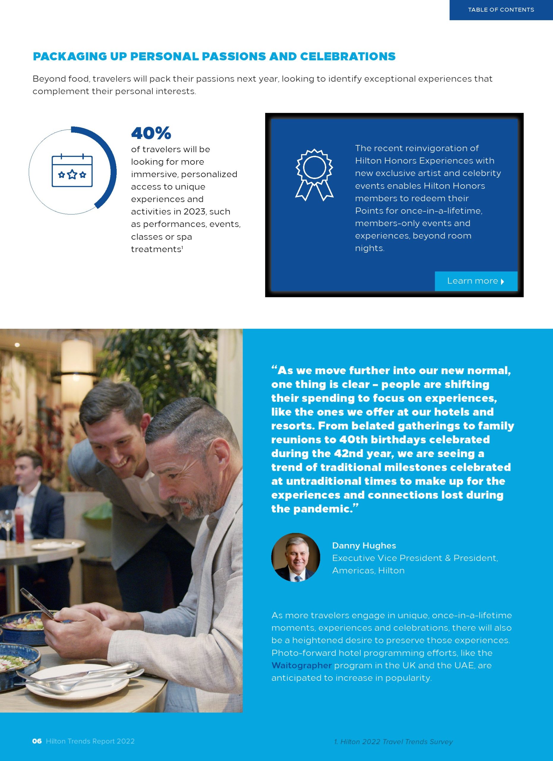 旅行是发现不同文化和观点的门户。2023年,人们将把旅行作为与朋友、家人、同事、客户、文化和地球建立更深层次联系的一种方式。人们对独特而引人入胜的体验、设计和餐饮项目的兴趣将越来越大,尤其是那些将游客与当地社区联系起来的项目。