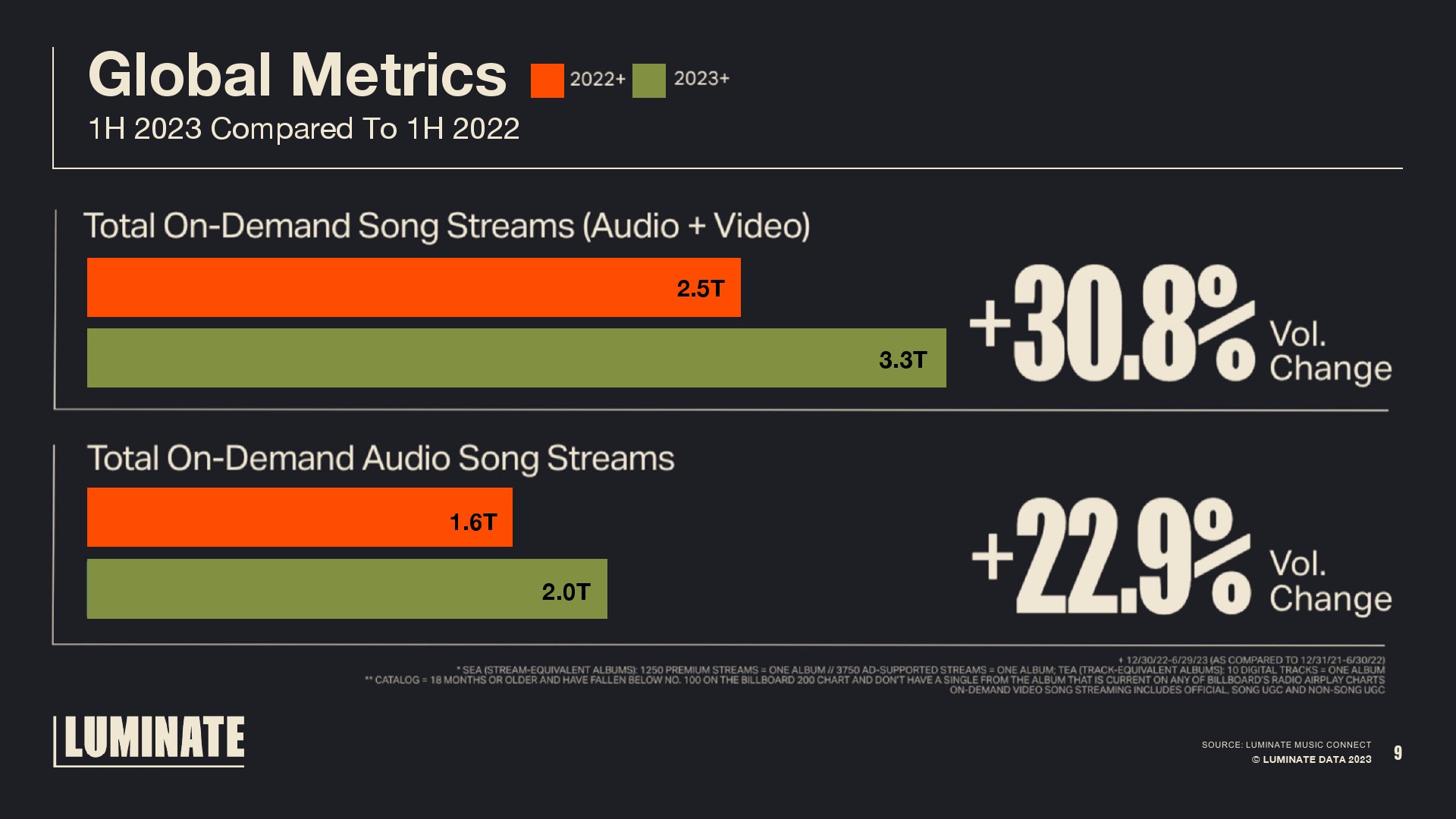 从全球来看,2023年上半年按需歌曲(音频+视频)播放量同比增长30.8%,从2.5万亿首增长至3.3万亿首。音频音乐播放量同比增长22.9%,从1.6万亿首增长至2万亿首。
