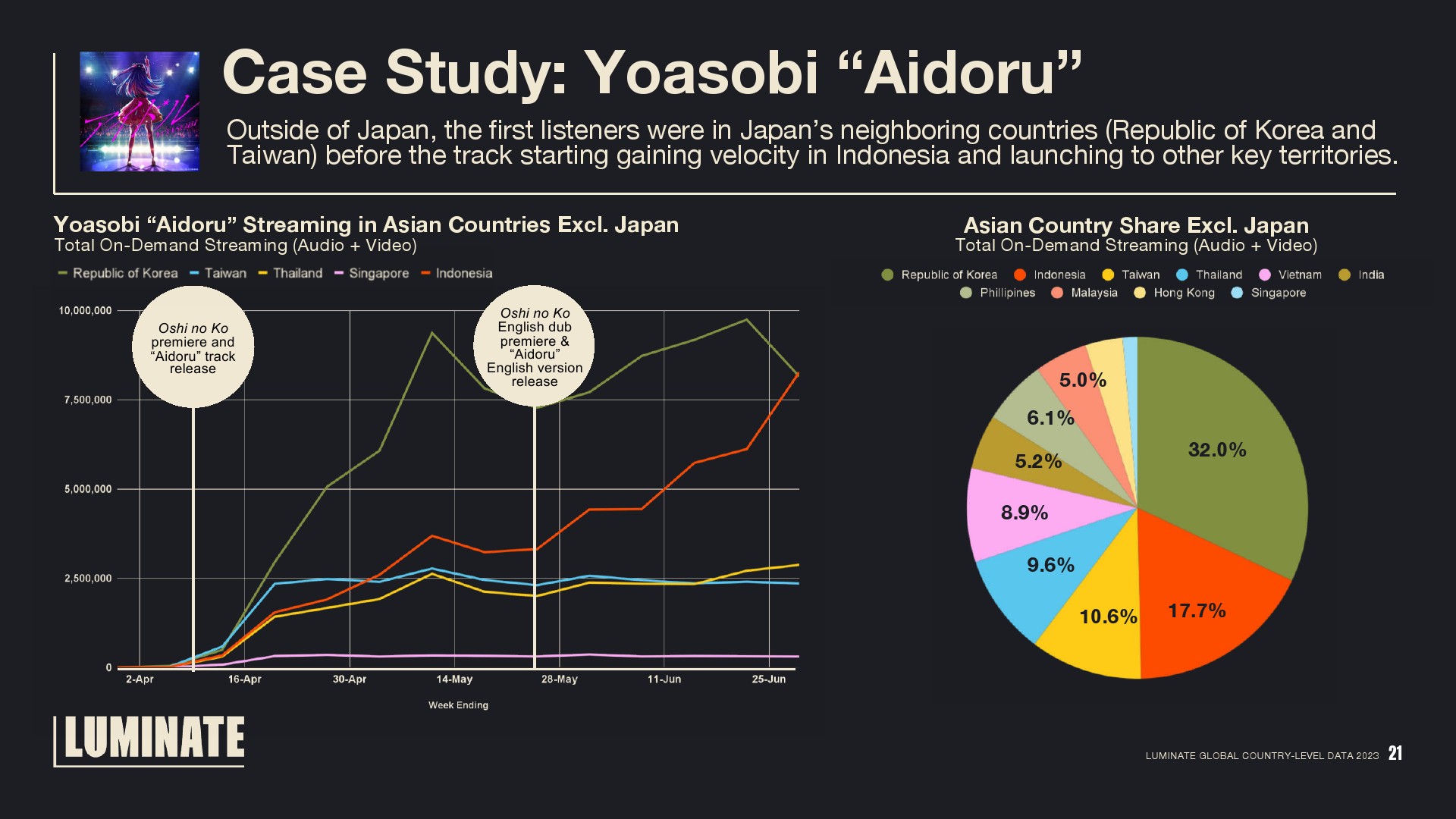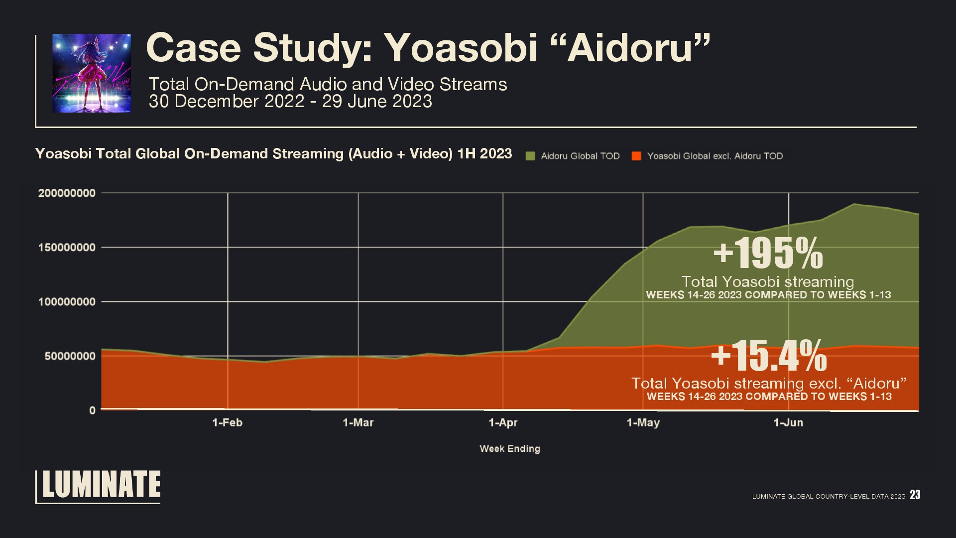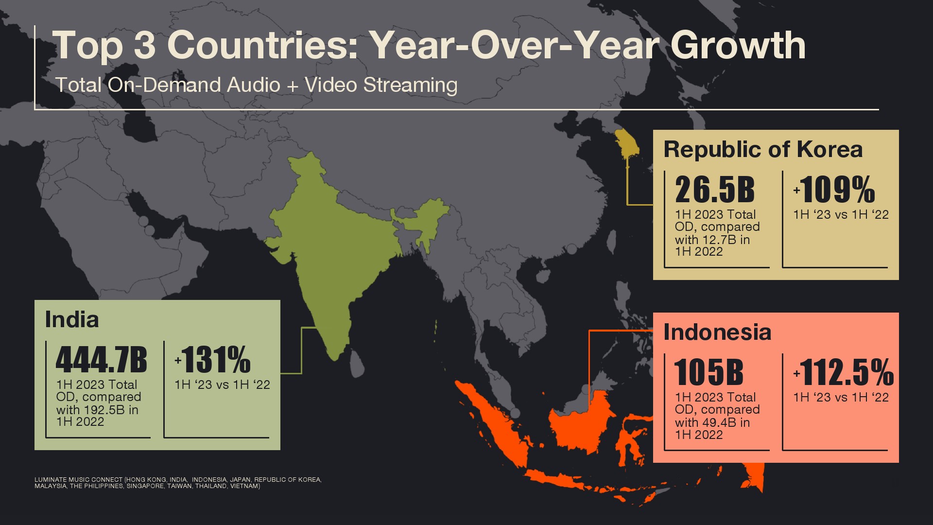 让我们将视线转向亚洲,2023年上半年音乐流(音频+视频)播放量增长107.4%,从4003亿首增长至8304亿首。