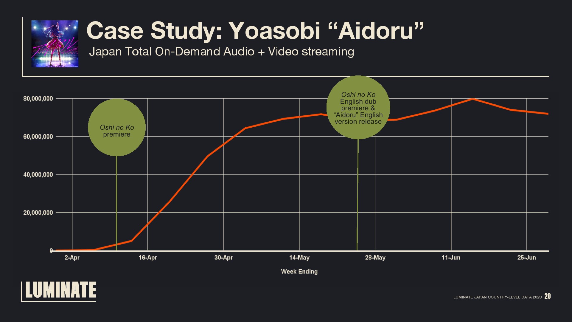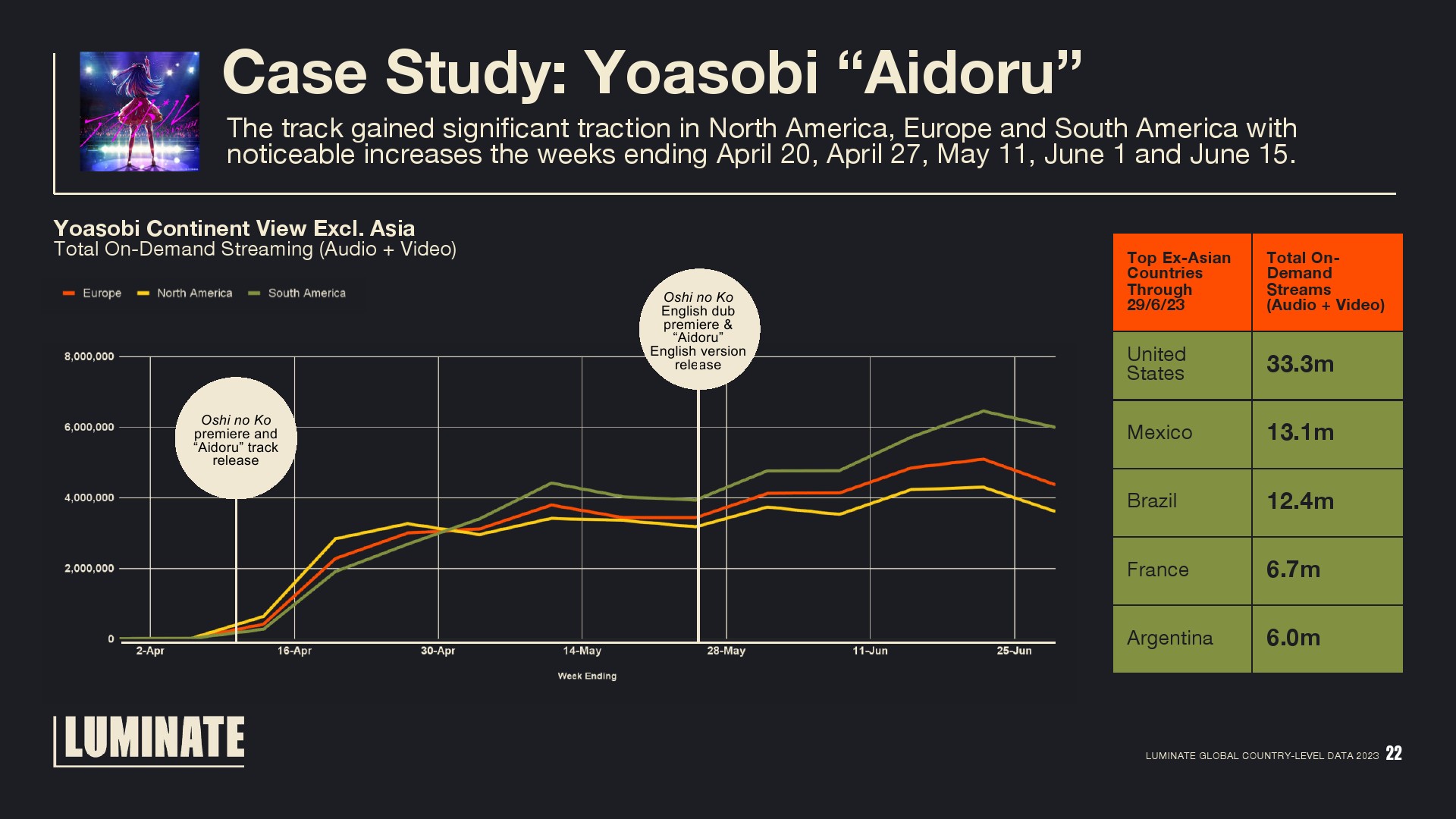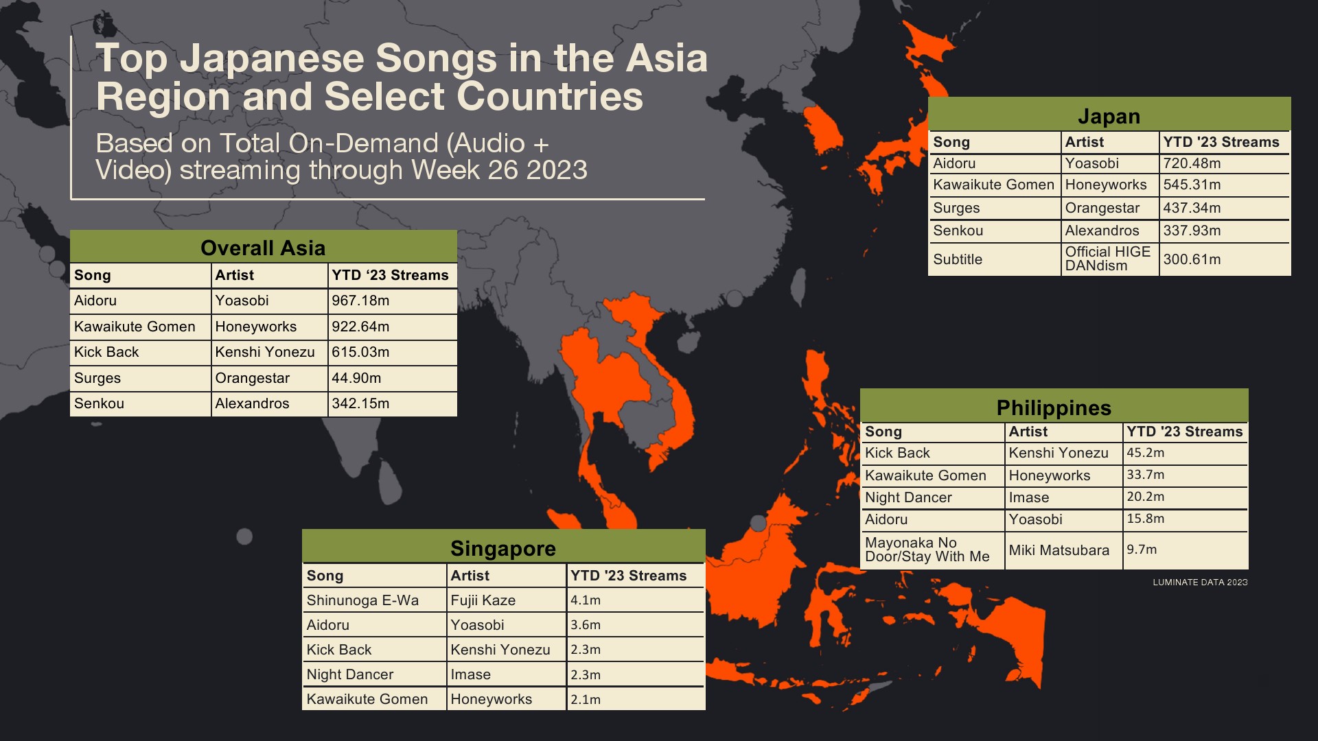 让我们将视线转向亚洲,2023年上半年音乐流(音频+视频)播放量增长107.4%,从4003亿首增长至8304亿首。