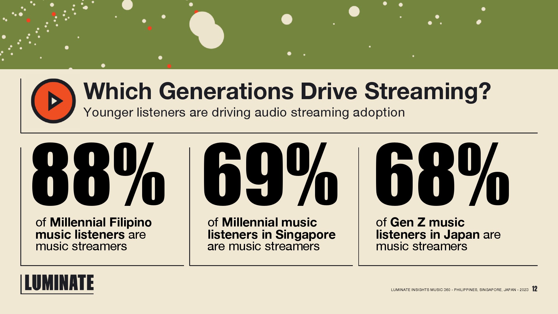 不出所料,年轻受众正在推动亚洲地区音频流媒体的普及。88%的菲律宾千禧一代音乐听众收听流媒体。