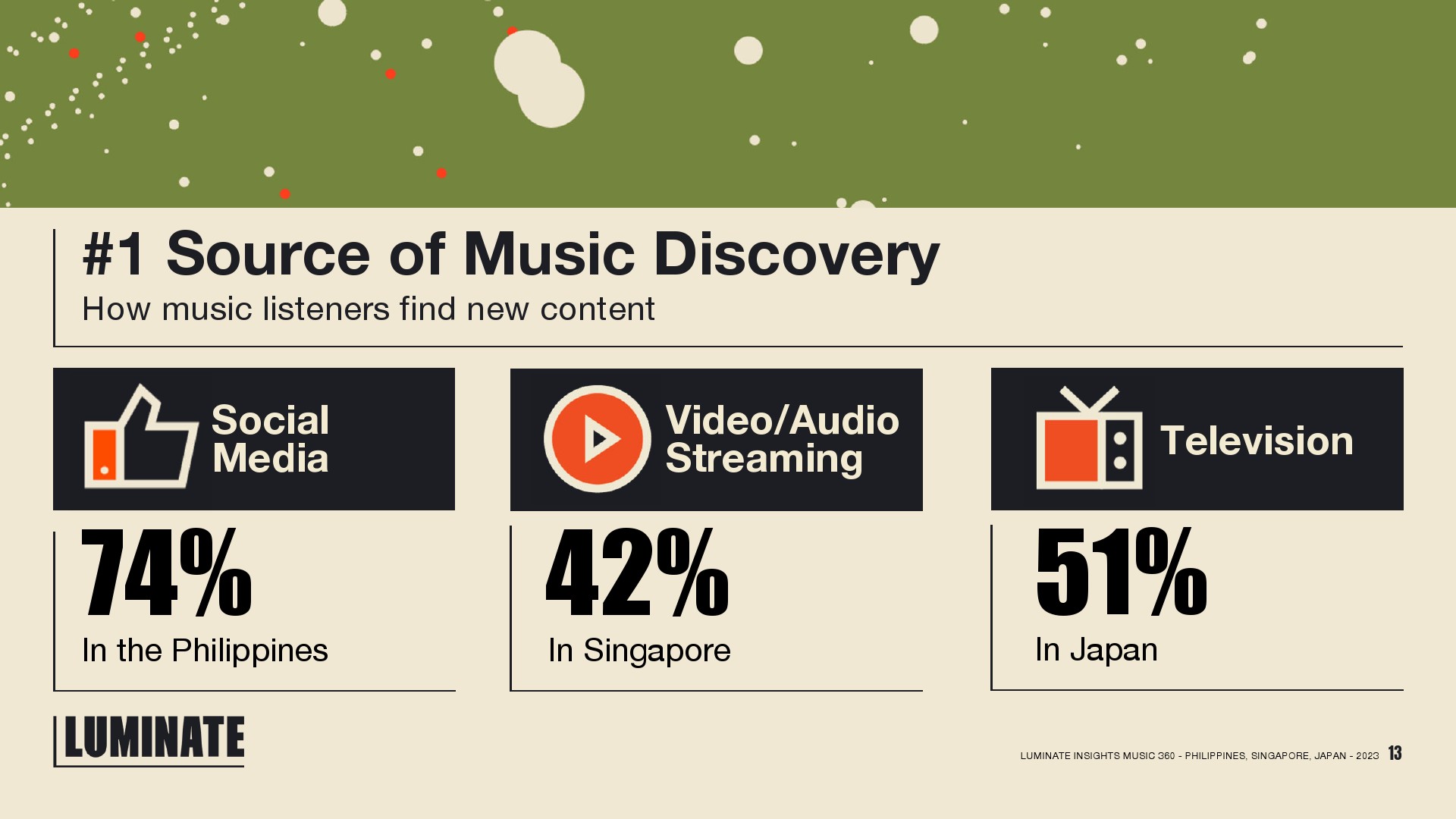 虽然各国受众发现音乐流的平台相似,但是在各个国家主流平台各不相同。例如,74%的菲律宾受众从社交媒体发现新音乐;42%的新加坡听众从视频或音频流平台发现新音乐;51%的日本人从电视上发现新音乐。