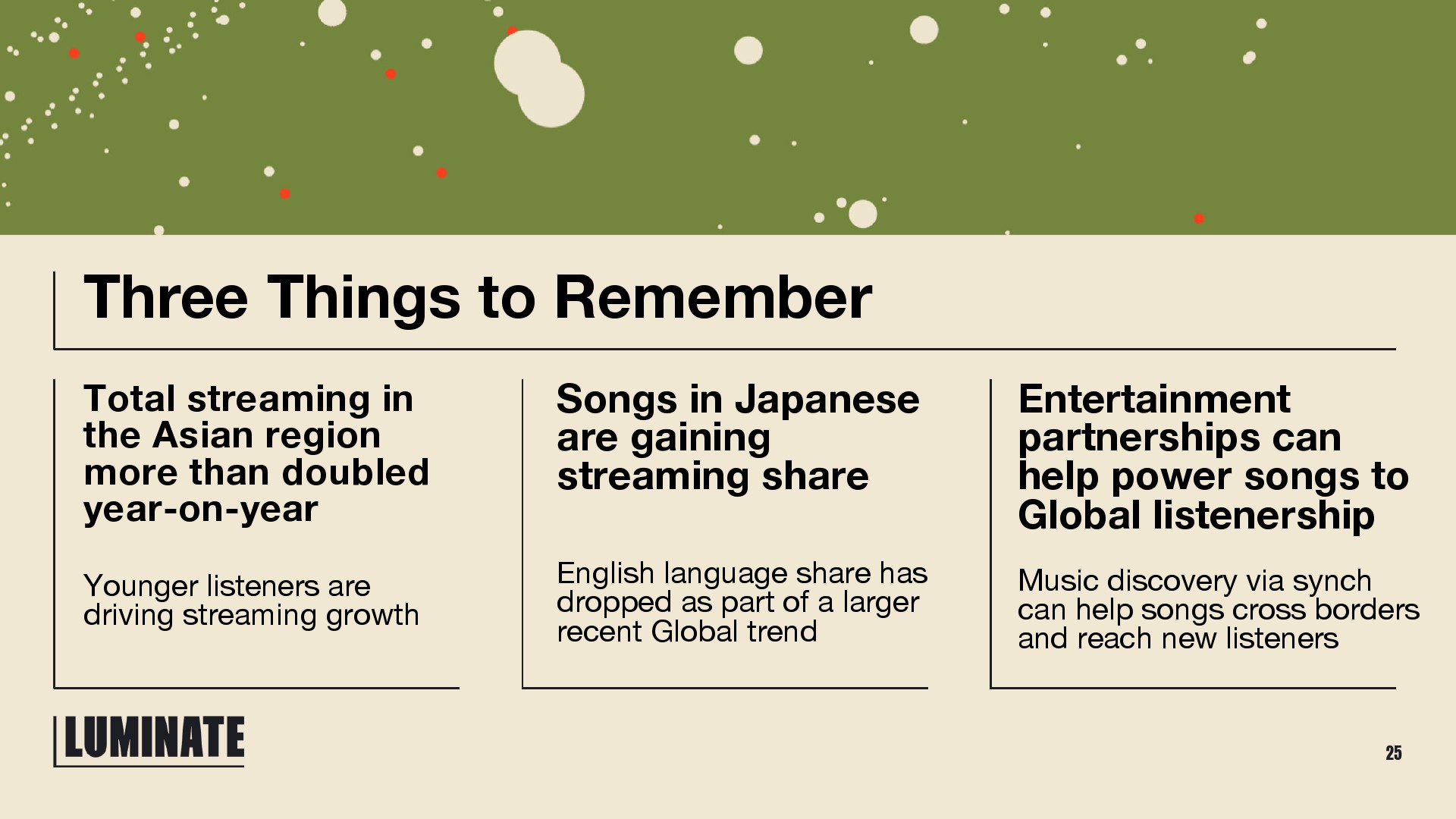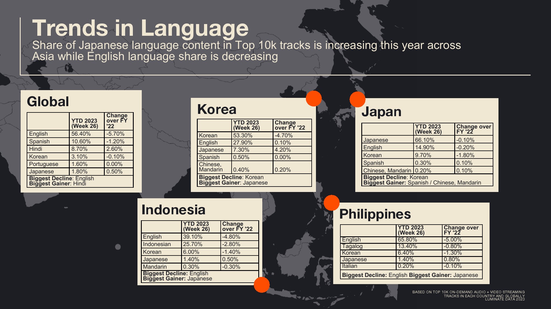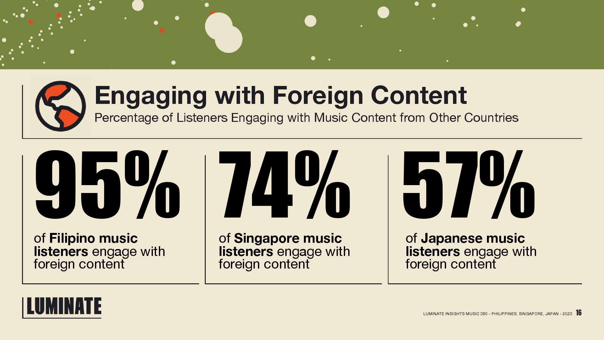 有趣的是,在今年十大音乐榜单上日语内容的份额有所上升,而英语内容则有所下降。亚洲音乐迷还喜欢听外国歌曲,例如95%的菲律宾听众会收听外国音乐;74%的新加坡和57%的日本音乐迷也会收听外国音乐。