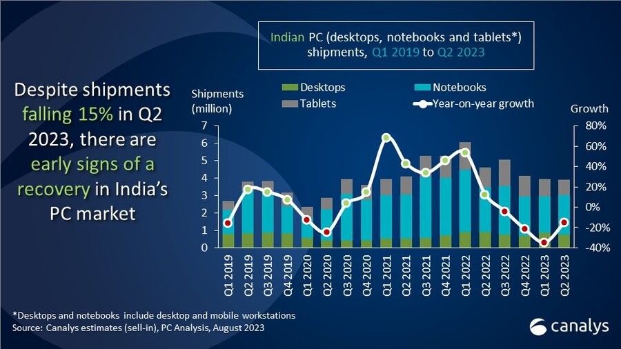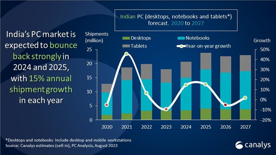 Canalys对印度PC(包括平板电脑)市场的最新预测显示,到2023年,其出货量将下降9%。但人们对2024年和2025年的反弹持乐观态度,预计这两年的出货量将同比强劲增长15%。这种增长预计将遍及所有类别和终端用户群体。印度PC使用和采用的基本面依然强劲,Canalys预计2022年的出货量峰值将被超越。