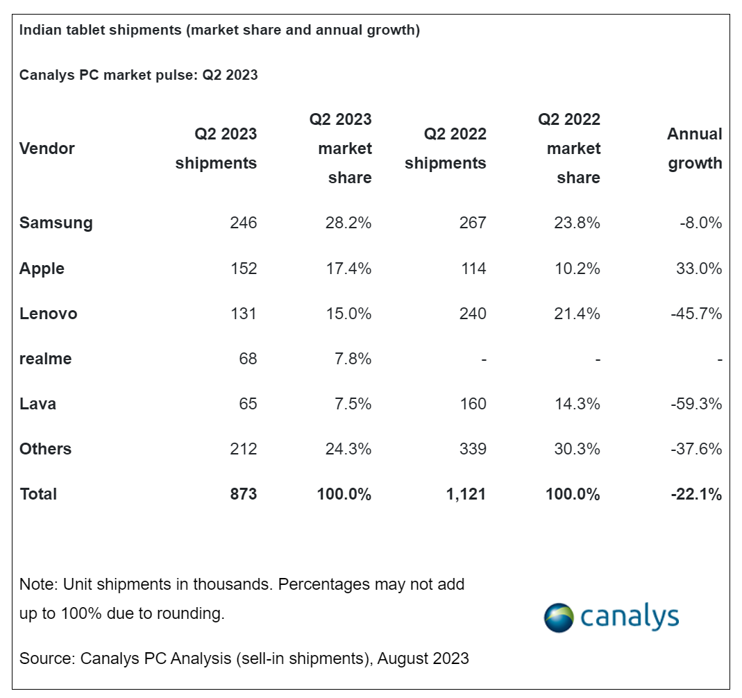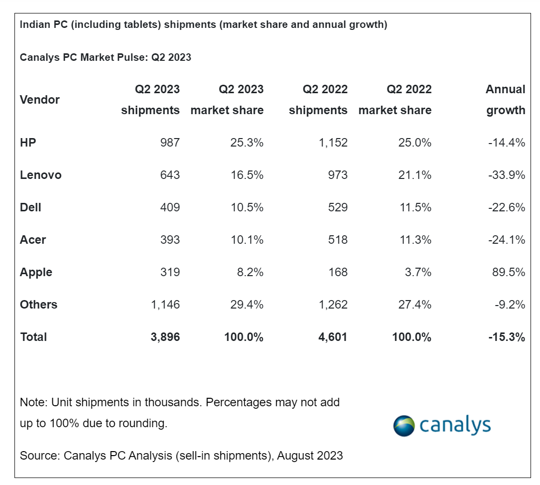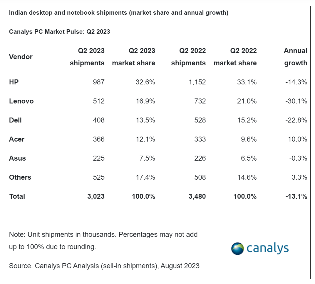 2023年第二季度,印度PC的所有细分市场都经历了同比下降。尽管经济信心有所改善,但商业部门经历了大幅下滑,主要是由中小企业推动的。公共部门也下降了9%,但一些有希望的交易暗示到2023年底可能会增长。尽管消费市场同比下降了13%,但却实现了7%的环比增长,这表明随着节日季的临近,市场出现了积极的复苏迹象。