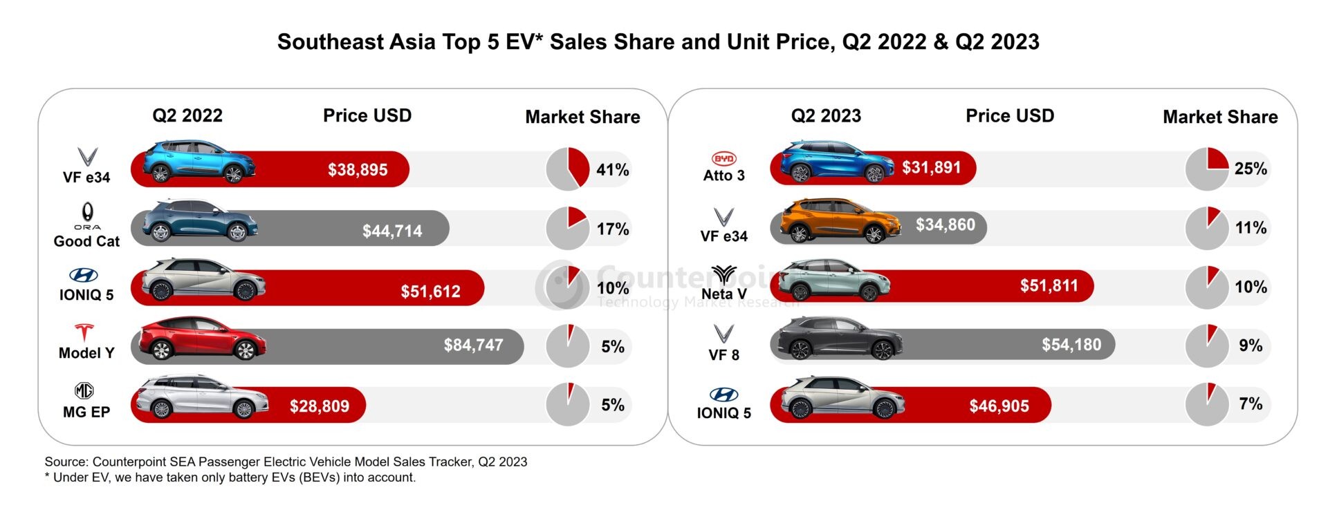 根据Counterpoint Research最新的东南亚乘用车追踪报告,受泰国、越南、印度尼西亚和马来西亚等国强劲需求的推动,该地区2023年第二季度电池电动汽车(BEV)销量增长了894%。