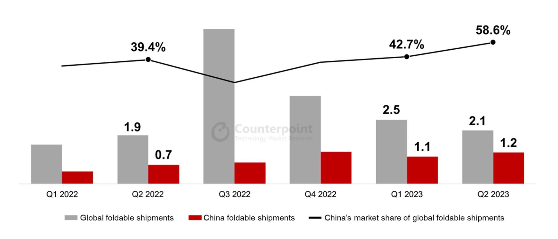 中国市场的可折叠智能手机格局呈现出一个特别有趣的场景。在2023年第二季度,中国智能手机市场的整体出货量同比下滑4%,达到6190万部,受到中国近期面临的经济挑战的影响,消费者支出减少。但是,中国可折叠智能手机市场取得了显著成功,同比增长64%,达到120万部。中国目前在全球可折叠智能手机市场占有最大份额,为58.6%。
