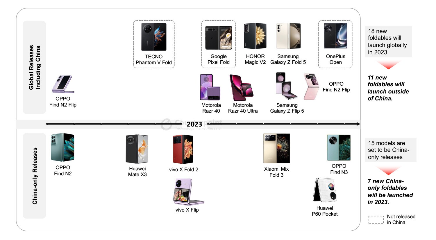 2023年第二季度,可折叠市场的持续增长势头正在形成。这一增长是由华为Mate X3、vivo X Fold 2和vivo X Flip等主要针对中国可折叠手机市场的关键产品的推出推动的。此外,摩托罗拉Razr 40和Razr 40 Ultra的全球(包括中国)发布进一步促进了这一增长趋势。在2023年第二季度,中国推出了五款针对其市场量身定制的新型折叠式产品,而同期中国以外的全球市场仅推出了两款折叠式产品。
