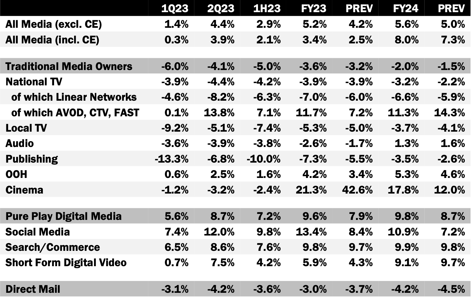 只有纯数字媒体供应商真正受益(2023年第二季度增长8.7%),而传统媒体公司继续挣扎(-4.1%)。