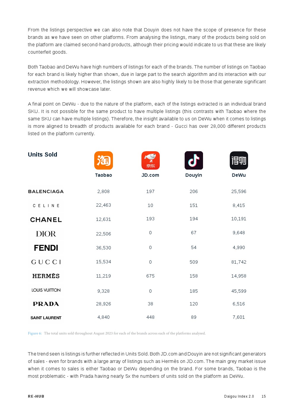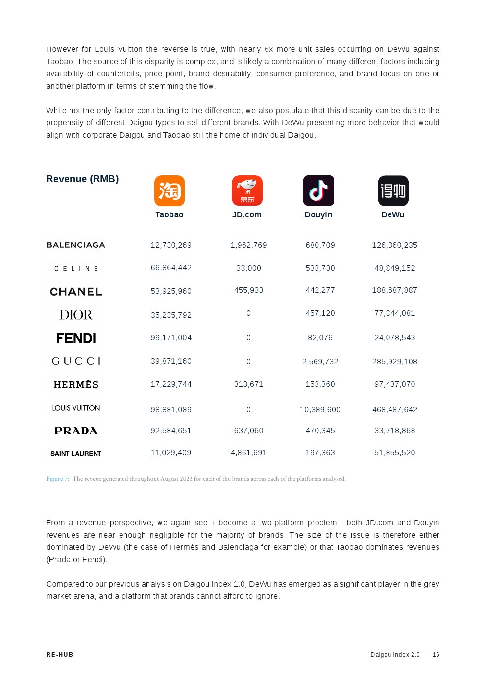 数据(针对10个主要类别的顶级奢侈品牌)显示,在2023年8月,总收入约为20亿元人民币。淘宝仅占总收入的26%,而得物以73%的收入成为市场领导者。