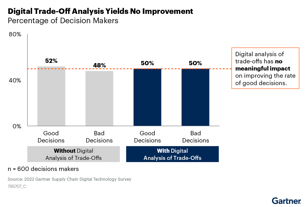 Gartner的研究基于对2022年12月收到的600份供应链决策者调查回复的分析,目前使用数字模型来分析权衡对良好决策结果没有显著影响。