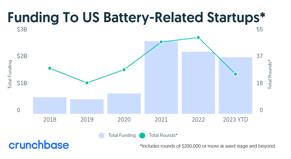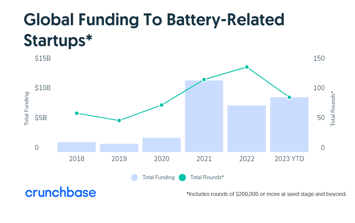 除了这些巨额融资外,与电池相关的整体风险投资也保持强劲。根据Crunchbase的数据,2023年全球投资将超过2022年和2021年的水平