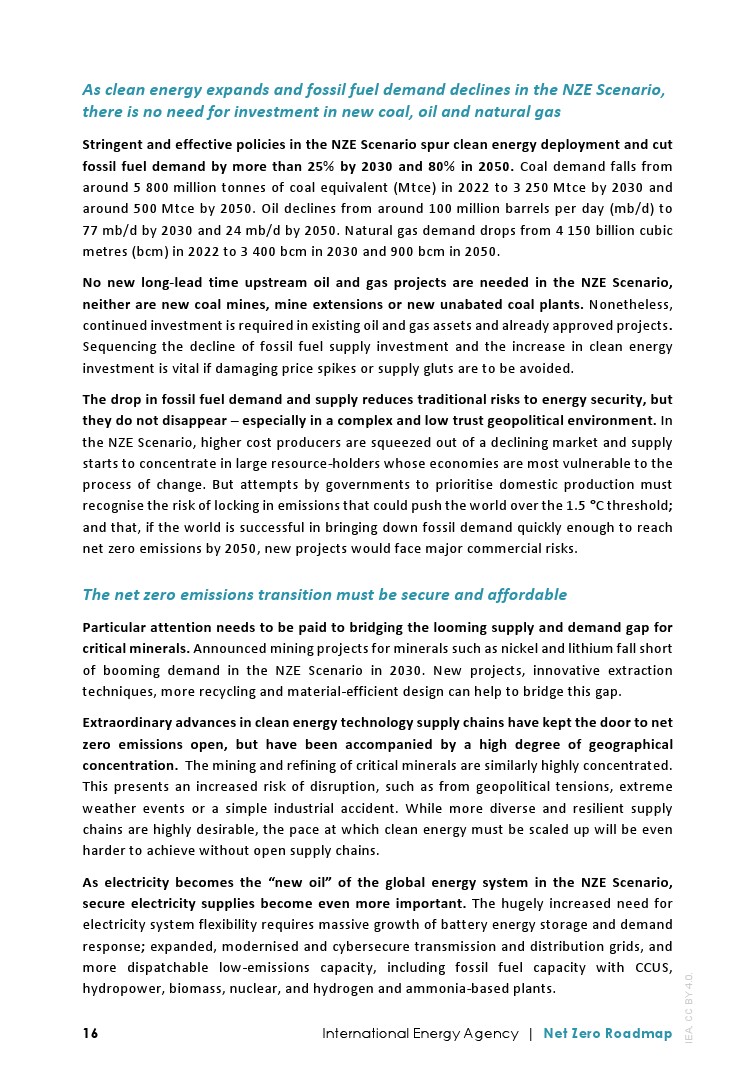 在NZE情景中,随着清洁能源的扩张和化石燃料需求的下降,没有必要投资新的煤炭、石油和天然气