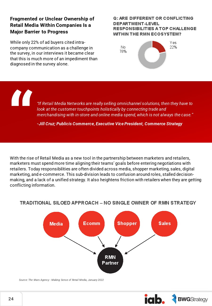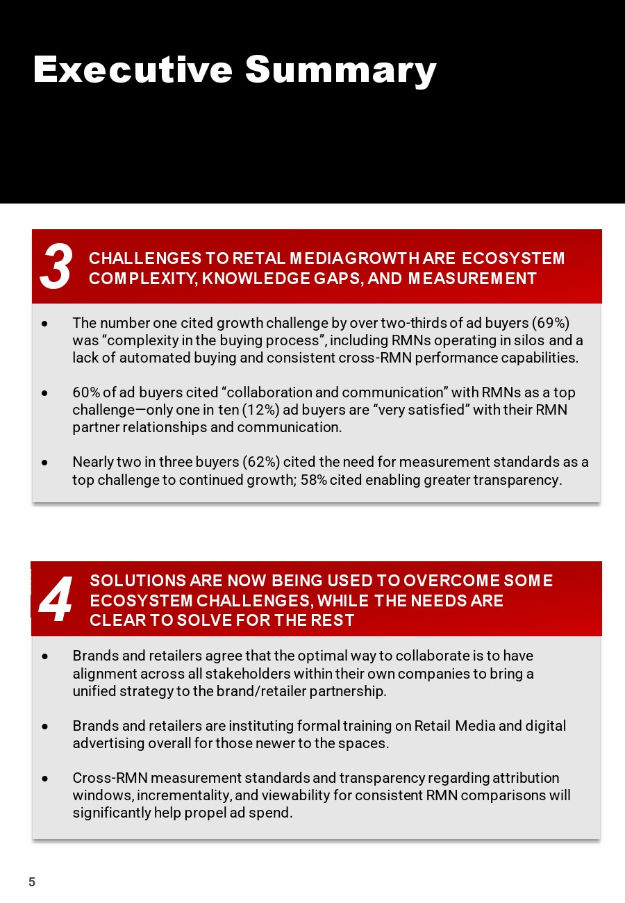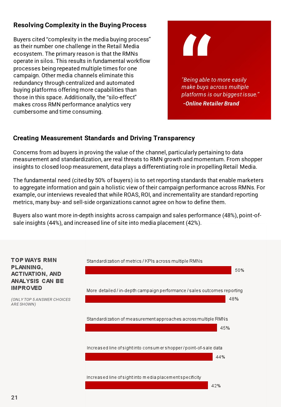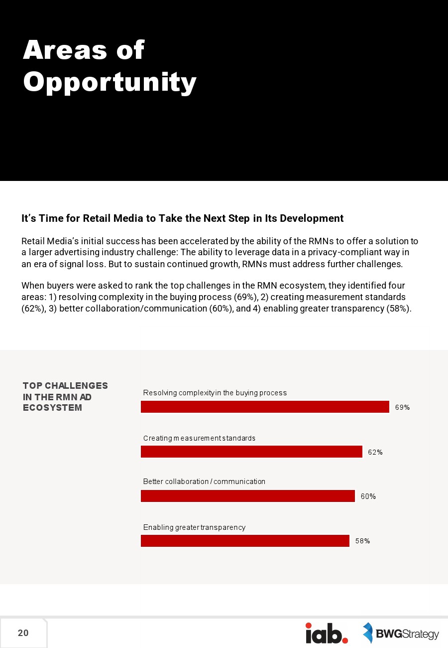 超过2/3的广告买家(69%)认为,增长面临的最大挑战是“购买过程的复杂性”,包括RMN孤立运作、缺乏自动化购买和一致的跨RMN性能。