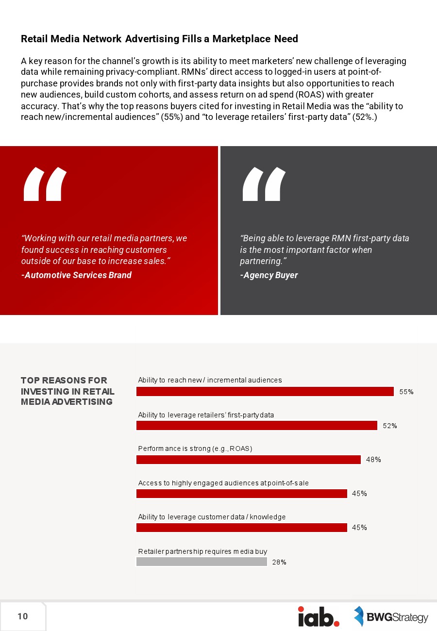 零售媒体网络(RMN)广告买家将获取增量受众(55%)、利用零售商第一方数据(52%)、实现强劲业绩(48%)和利用客户数据(45%)作为投资的主要原因。