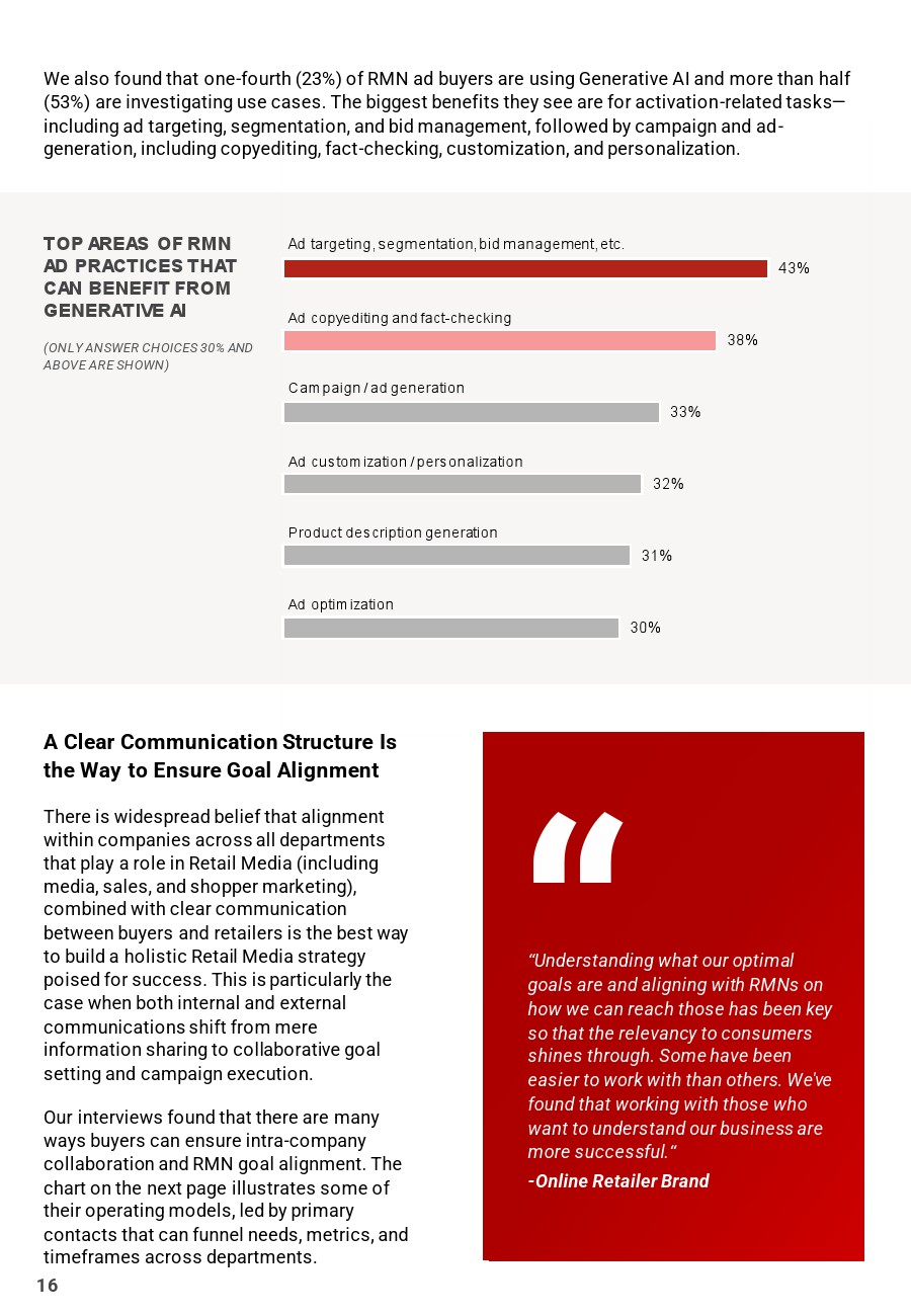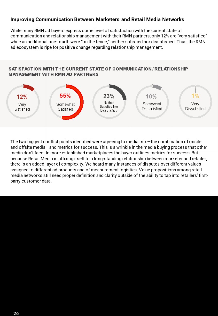 60%的广告买家认为与RMN的“协作和沟通”是最大的挑战,只有12%的广告买家对他们的RMN合作伙伴关系和沟通“非常满意”。