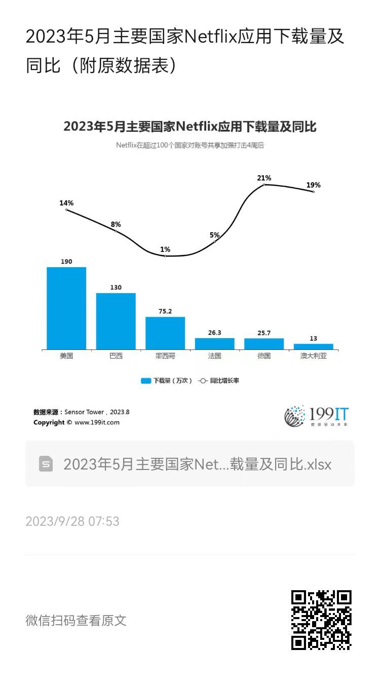 2023年5月主要国家Netflix应用下载量及同比(附原数据表) ​​​