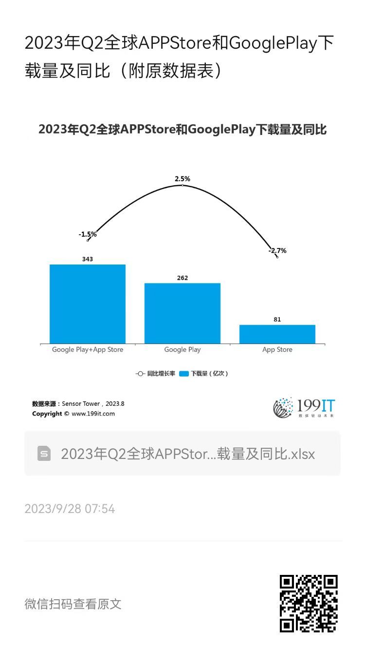 2023年Q2全球APPStore和GooglePlay下载量及同比(附原数据表) ​​​