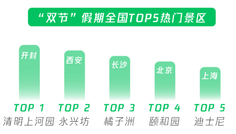 微信报告还显示,“双节”假期全国TOP5热门景区分别为:开封清明上河图、西安永兴坊、长沙橘子洲、北京颐和园、上海迪士尼。