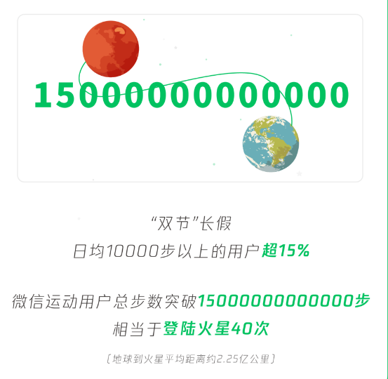 微信运动用户总步数突破15万亿步,相也就是90亿公里,相当于登陆火星40次(地球到火星平均距离2.25亿公里)。