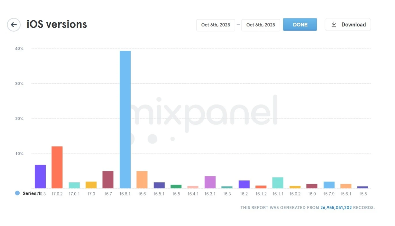 截至10月6日iOS 17发布18天后的安装率约为23% iOS 17已经发布超过半个月了,但是大家更新的欲望并不强。目前统计的数据显示,截至10月6日,iOS 17 发布18天后的安装率约为23%,作为对比在发布18天后,iOS 16的安装率为29%。 数据中,有12.13%的用户使用iOS 17.0.2系统,6.84%用iOS 17.0.3,2%的坚持使用iOS 17。作为对比,而iOS 16.6.1、16.7加起来的用户大约为45%。 从不少用户反馈的情况看,iOS 17并没有太好的升级欲望,带来的更新不是太多,老机型升级后可能会带来卡顿感等等,而iPhone 15 Pro发热等情况,也并没有引领用户更新的风潮。 对于iOS更新率的问题,苹果也一直很头疼,因为从iOS 12之后开始(当时的盛景是,发布两个半月内,70%符合条件的iPhone手机就安装上了),果粉更新大版本系统的热情越来越弱。 自 快科技 更多阅读:在过去四年中推出的所有iPhone升级iOS 15比例为72%苹果:数据显示iOS 16普及率超过80% iPadOS 16超过70%Counterpoint:华为HarmonyOS系统在中国的市场份额已经达到8%Counterpoint:2022年Q4华为鸿蒙OS全球市场份额2% 中国市场8%StockApps :2022年1年Android移动操作系统市场份额下降到69.74%Counterpoint:2021年全球高端智能手机市场销售额同比增长达有史以来最高的24%Mixpanel:iOS 15发布80天设备安装已近60%Mixpanel:截止2021年10月初iOS 15采用率或已达到19.3%苹果:iOS 14现已安装在过去四年中发布的90%的iPhone上Mixpanel:截止2021年4月iOS 14整体使用率达到90%iOS 12发布前夕:85%苹果用户仍使用iOS 11系统预计2024年7月新能源汽车渗透率达49.7% 同比去年-2.2%世界黄金协会:2017年Q4全球黄金需求同比下降18%IEA:全球能源部门2050年净零排放路线图(210页)荣耀锐意开拓市场:正式空降印尼