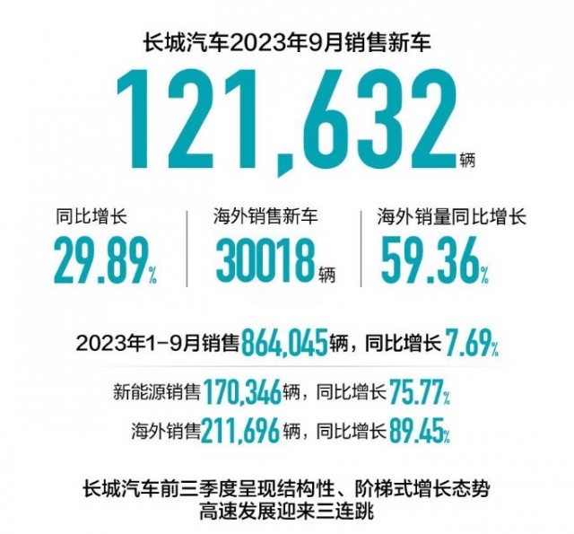 长城汽车日前公布了2023年9月及今年前三季度销量报告。今年9月,长城汽车销售新车12.16万辆,同比增长29.89%;今年1-9月,长城旗下各品牌累计销量达86.4万辆,同比增长7.7%,其中新能源车累计销量17万辆,同比增长75.77%。