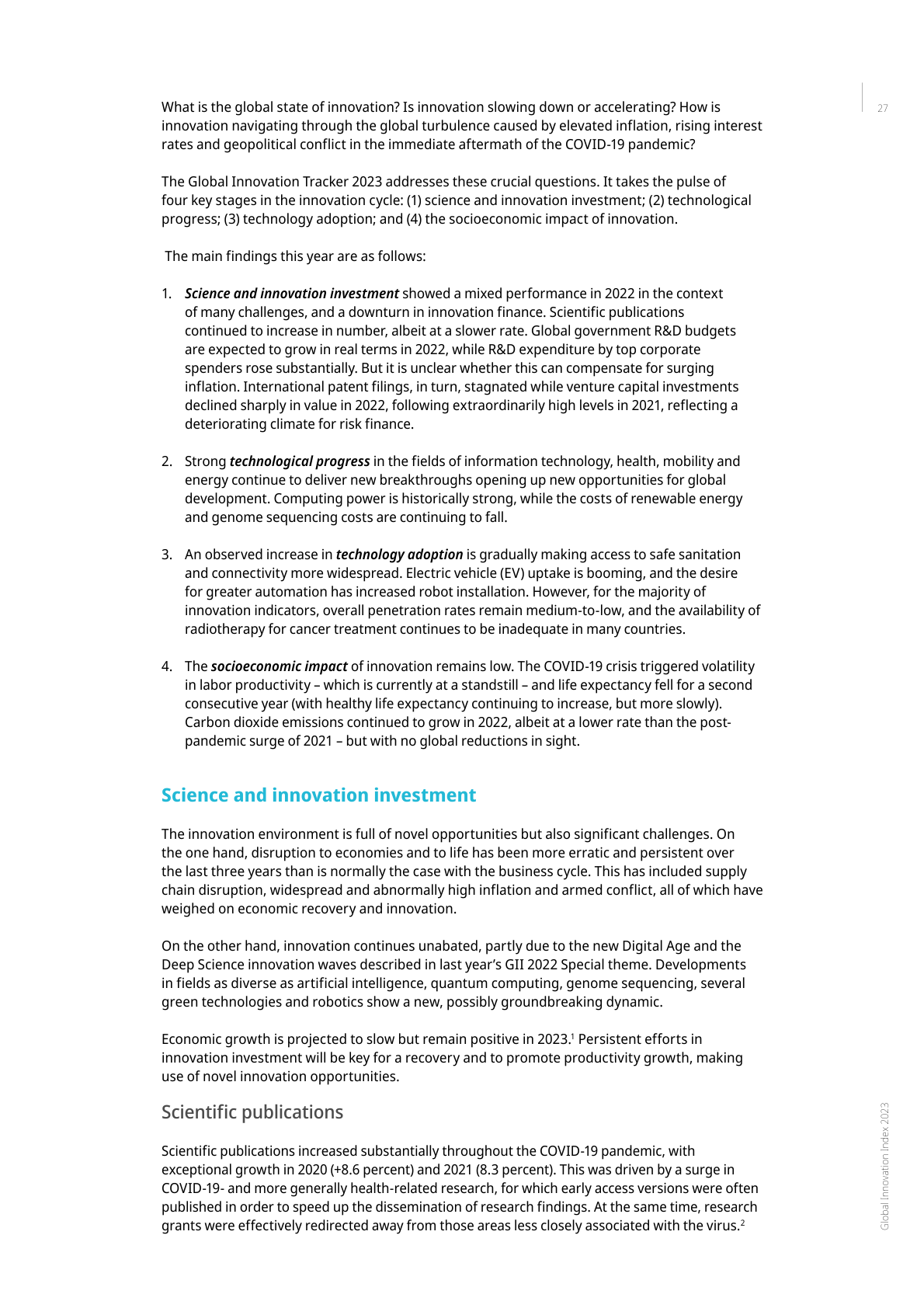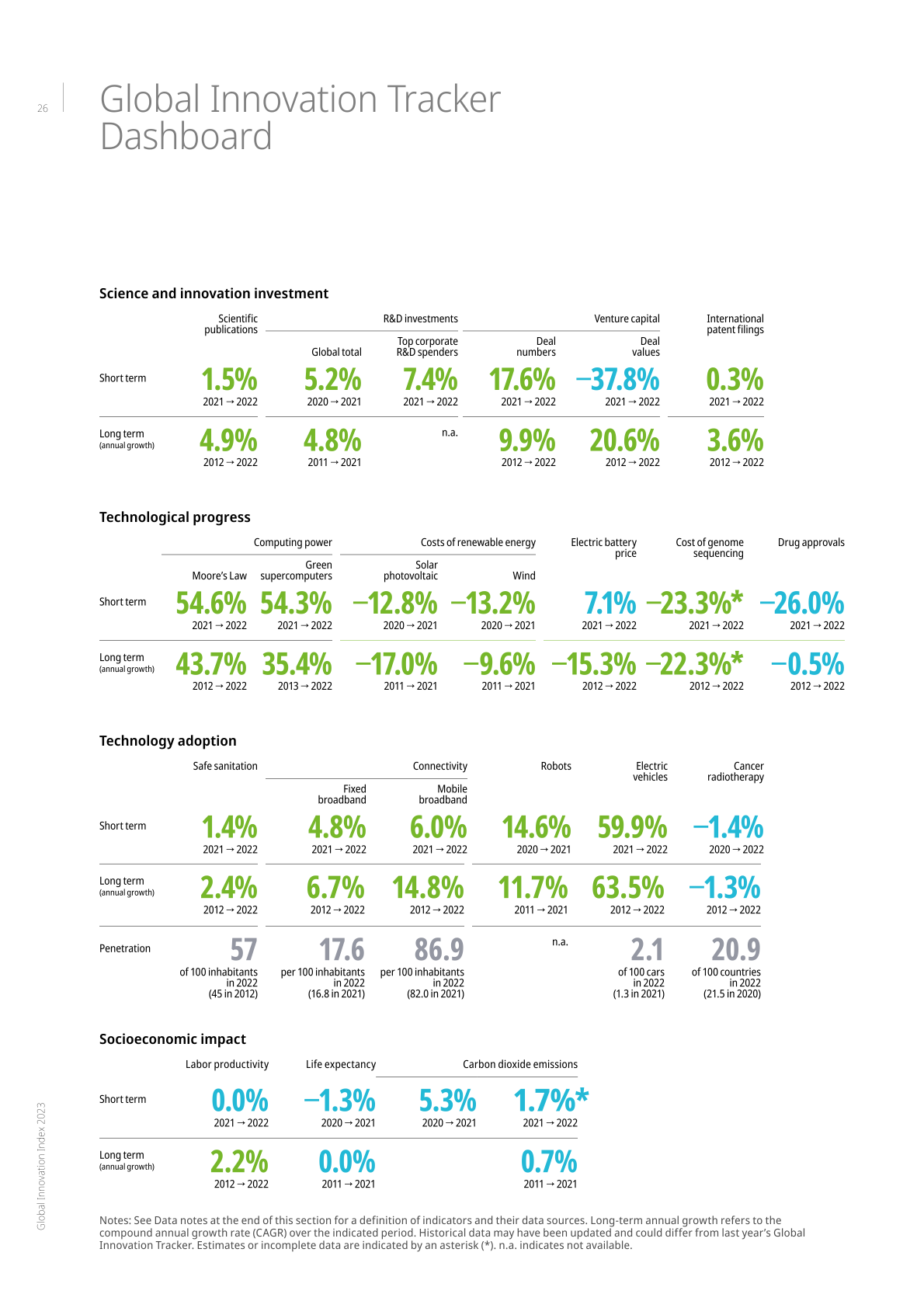《2023年全球创新指数》显示,过去一年,科学出版物、研发、风险资本交易(不包括价值)和专利等的数量继续增加,达到前所未有的水平。然而,增长率低于2021年的超常增长。