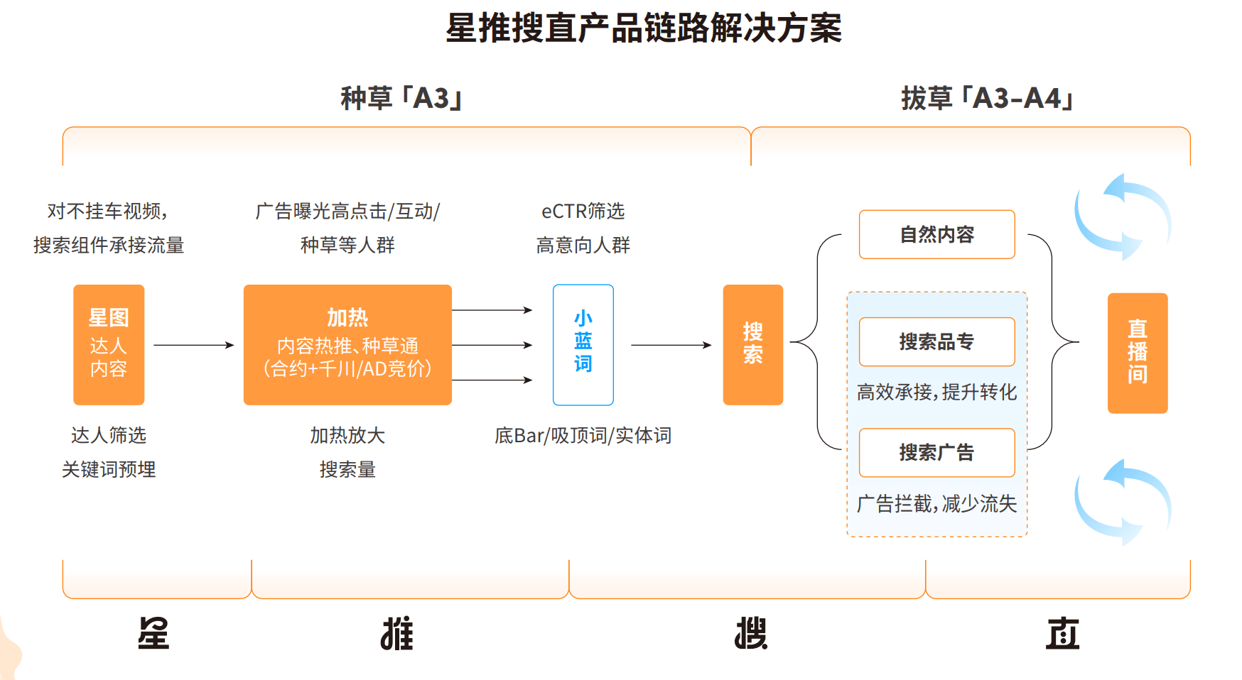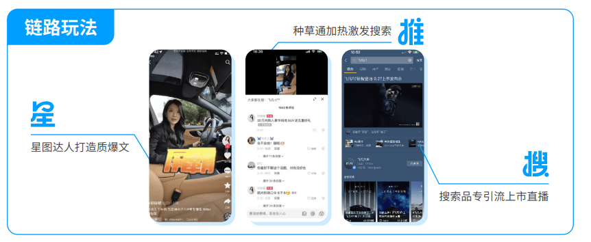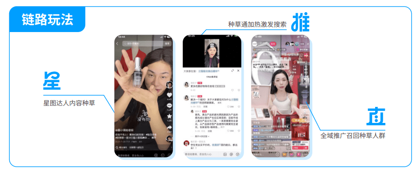 “星”即星图达人,是这条路径的起点,也是品牌种草的第一步,巨量星图优质的达人种草内容可以有效积累确定性A3人群。为了让好内容成为爆款,“推一把”也很重要。巨量引擎的种草通、内容热推等细分加热工具,可以加热“质爆”或“量爆”的星图爆文,放大流量,帮助品牌更高效灵活地获取A3人群,提升种草效率。在此基础上,配合品牌专属小蓝词,激发“看后搜”,搜索品专承接精准流量,最终通过电商品专直接引流直播间,或通过全域推广将种草人群召回直播间,从而加速成交转化。