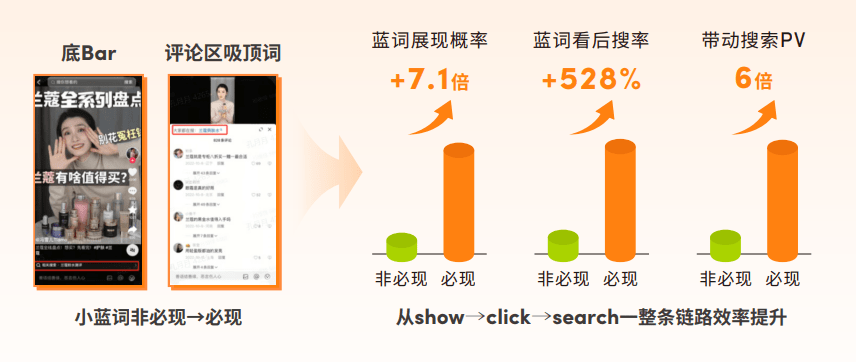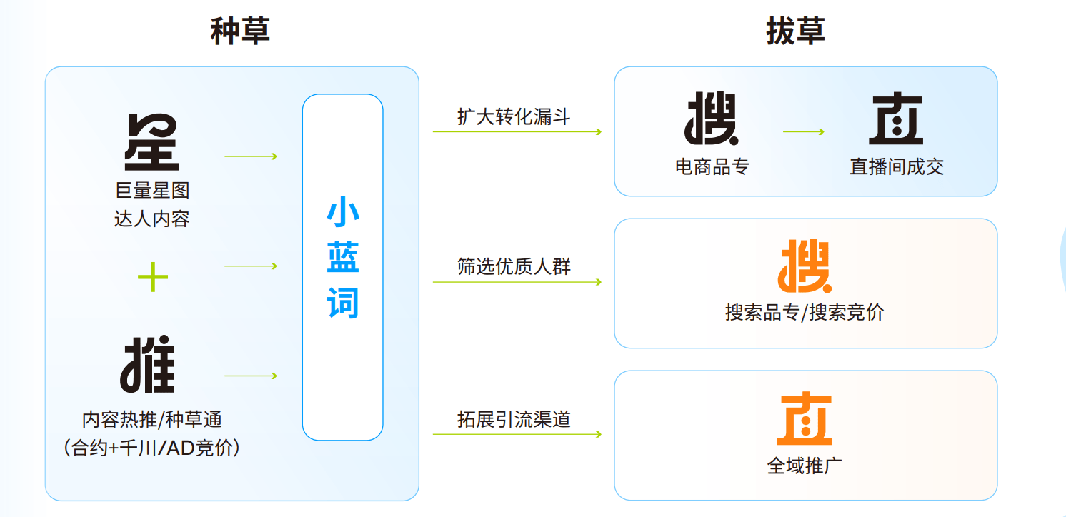 星+推+搜+直:星推打造爆款内容,加持品牌专属小蓝词,激发搜索,搜索品专直达直播间串联种收,推动种草人群在直播间的召回和转化。这一条紧密联动种收的链路,能够有效驱动新品上市及大促期生意增长。