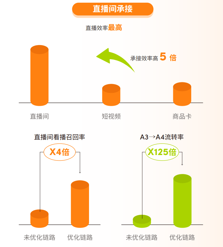 从购买转化效果来看,直播间承接效率最高。前序种草积累的A3人群,通过电商品专引流直播间,或通过推荐流模型定向召回,可有效带动A3到A4流转率提升,助攻直播间GMV爆发。