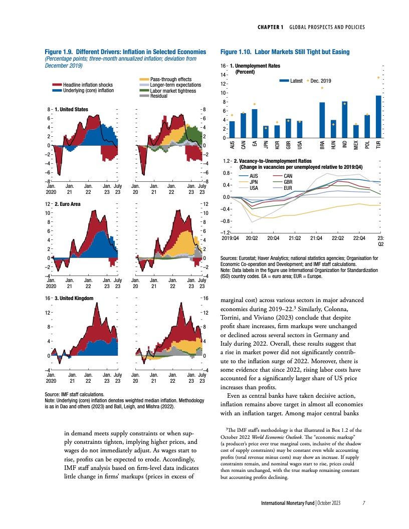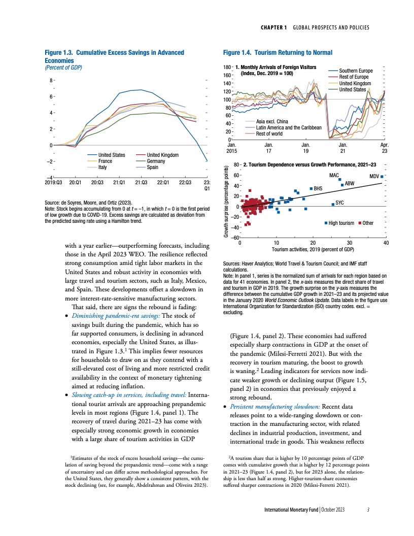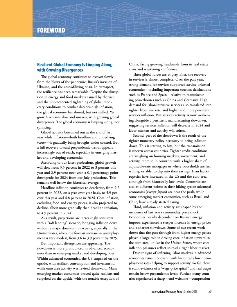 报告指出,各项预测值越来越符合经济“软着陆”情景,也即在不出现经济活动大幅下滑的情况下降低通胀。目前,三股力量正在发挥作用。