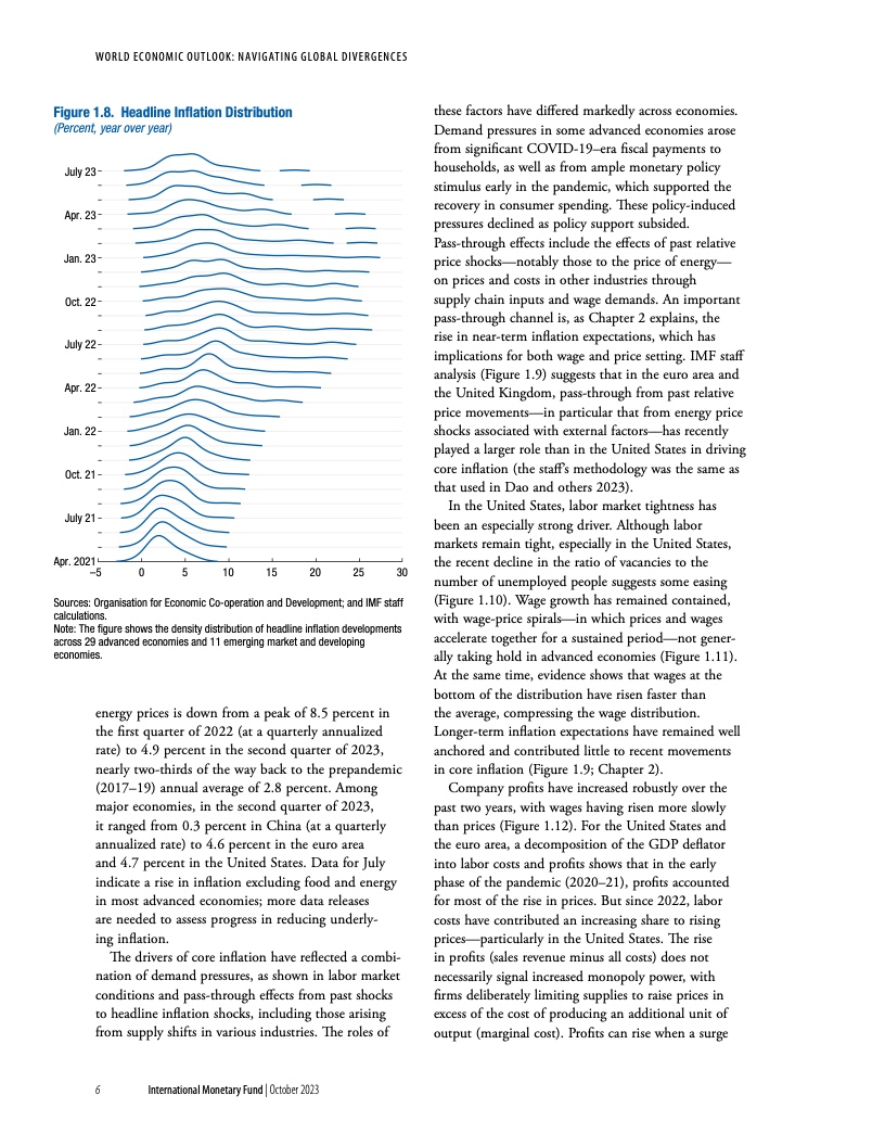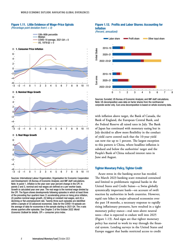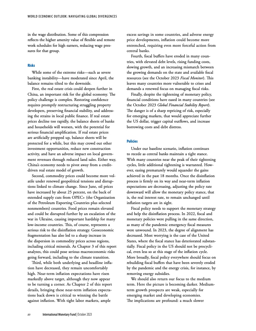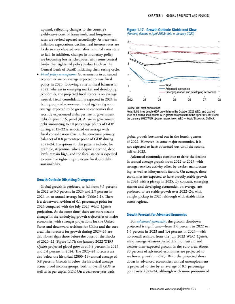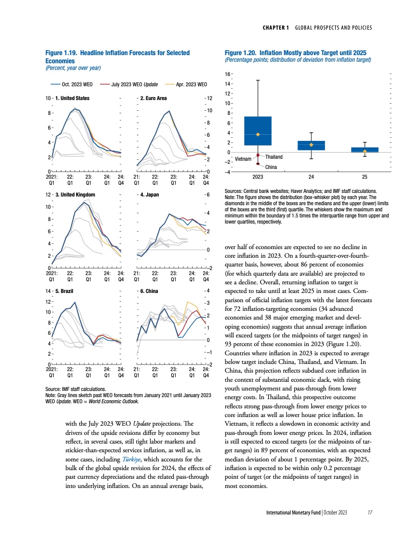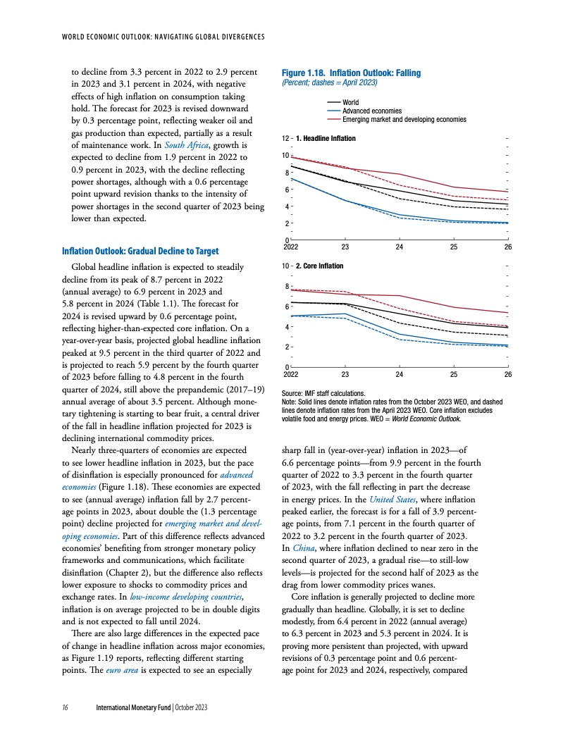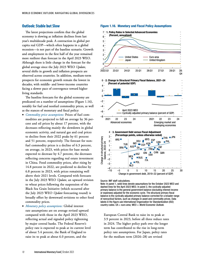 在基金组织的基线情景下,由于各国央行维持紧缩立场、避免过早放松货币政策,通胀将持续下降。一旦通胀下行趋势牢固确立、短期通胀预期下降、通胀开始向目标靠近,就应逐步下调政策利率,同时继续承诺维持价格稳定。