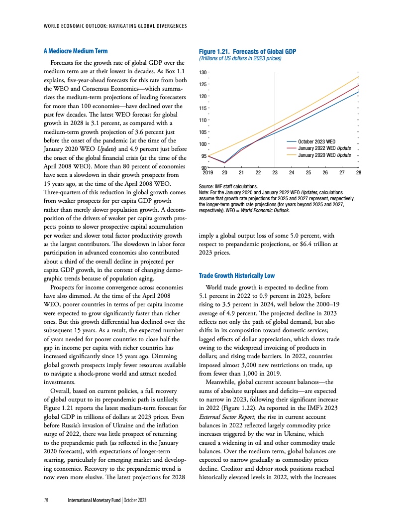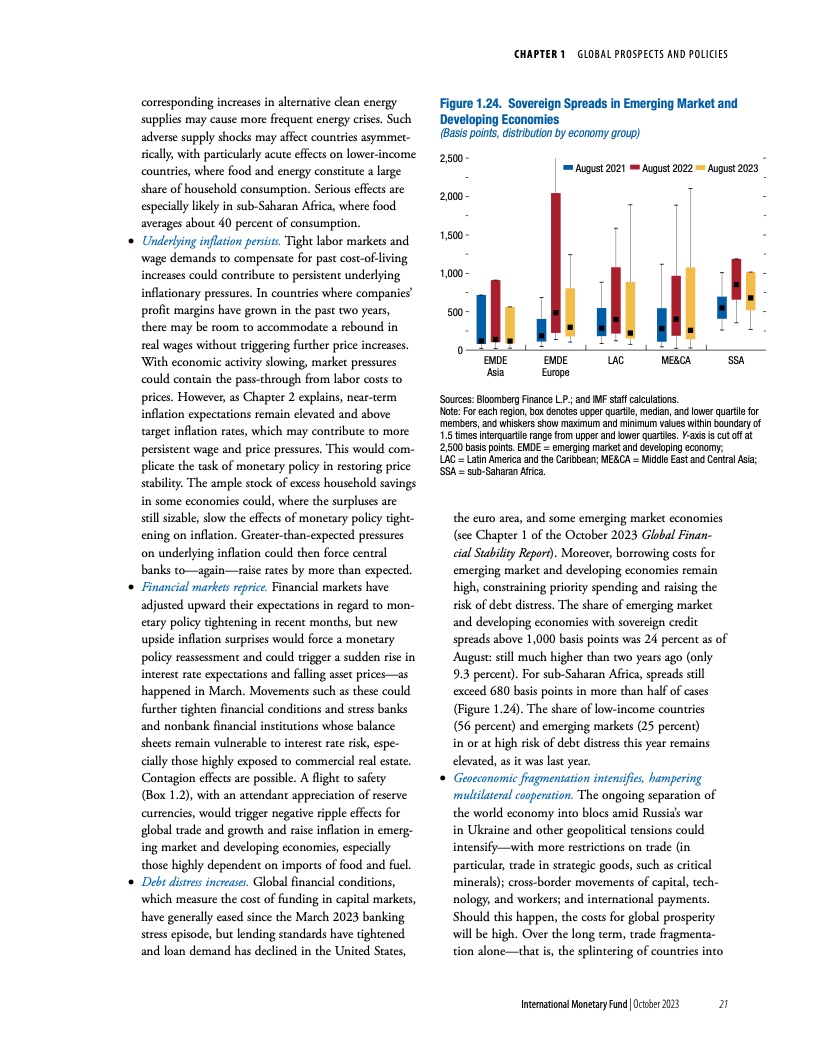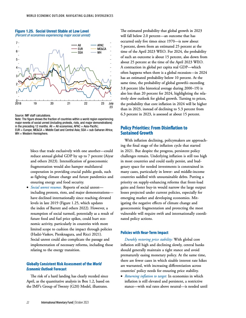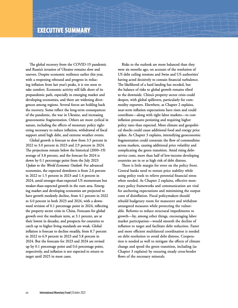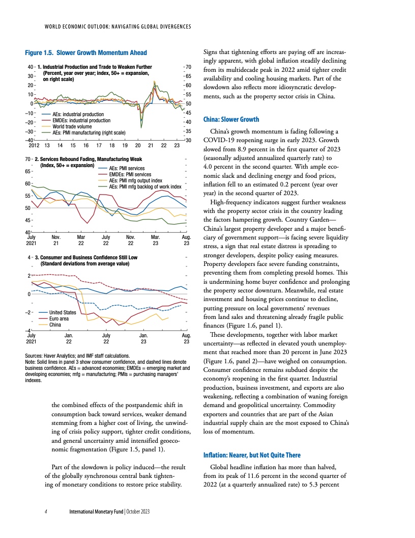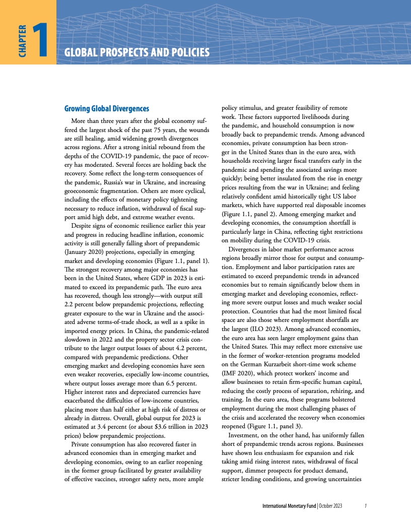 报告指出,尽管全球经济在今年早些时候展现出了韧性,经济重新开放带来了增长反弹,且通胀自在去年达到峰值后已有所下降,但现在放松警惕还为时过早。经济活动仍不及疫情前的水平(尤其是在新兴市场和发展中经济体),各个地区的分化日益扩大。多个因素正在阻碍经济复苏。