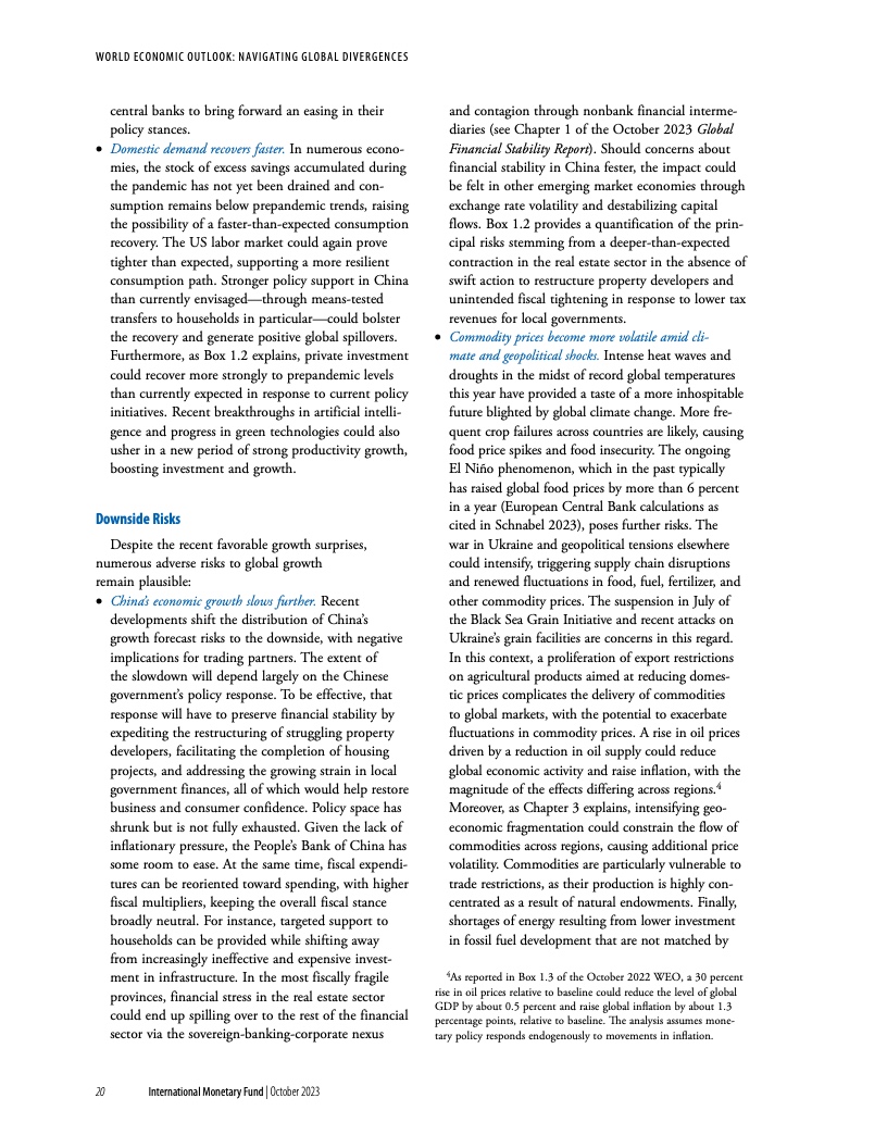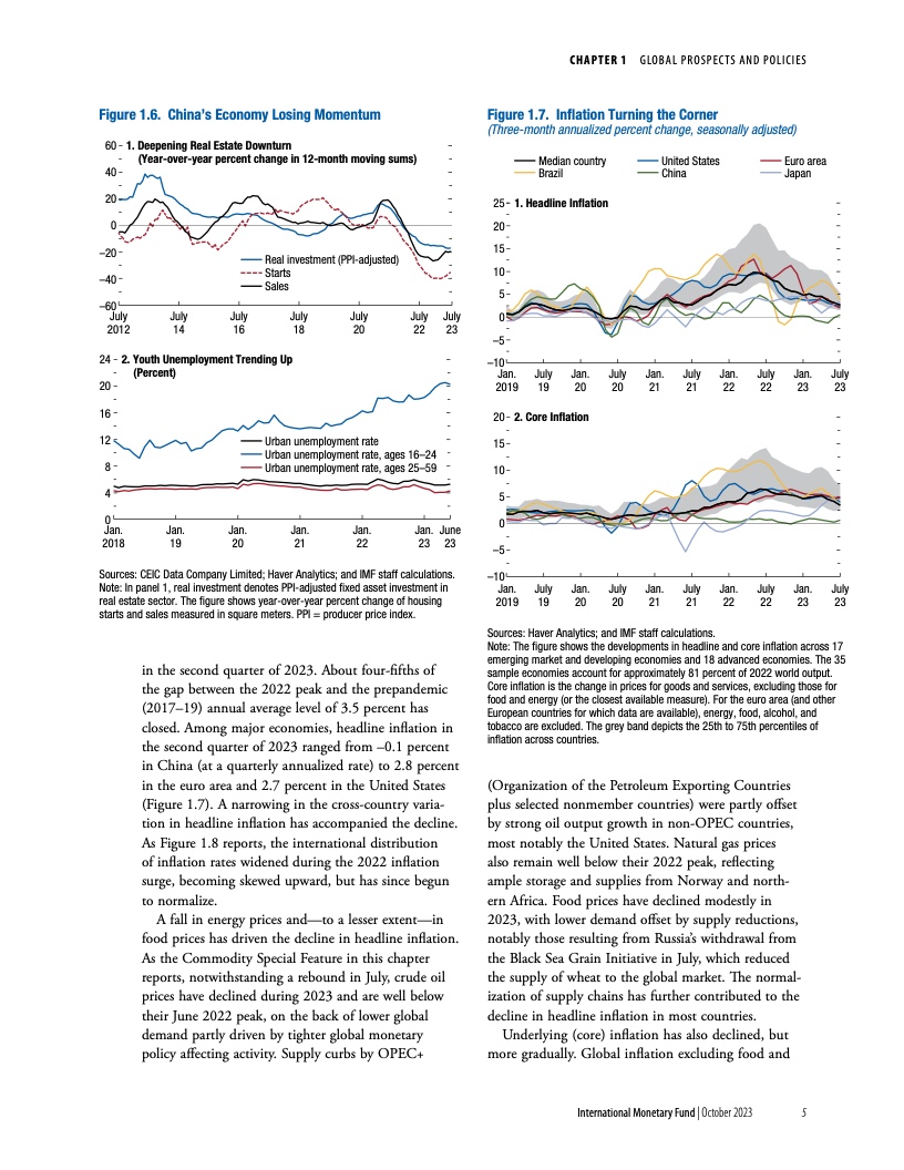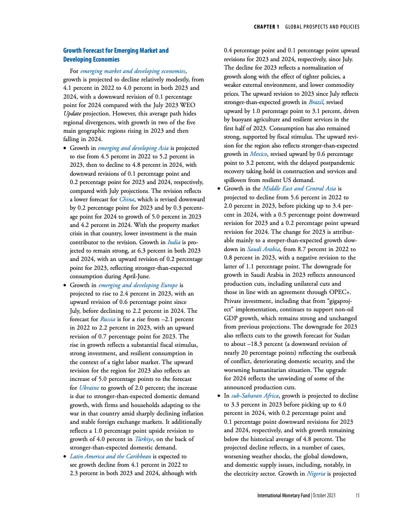 许多新兴市场经济体展现出的韧性也强于预期。新兴市场和发展中经济体2023年和2024年的经济增速预计将小幅下降,从2022年的4.1%降至2023年和2024年的4.0%。但中国是一个明显的例外,其面临着房地产危机和信心减弱带来的日益严峻的阻力。基金组织预测中国2023年经济增速为5%,相比7月预测下调了0.2个百分点。