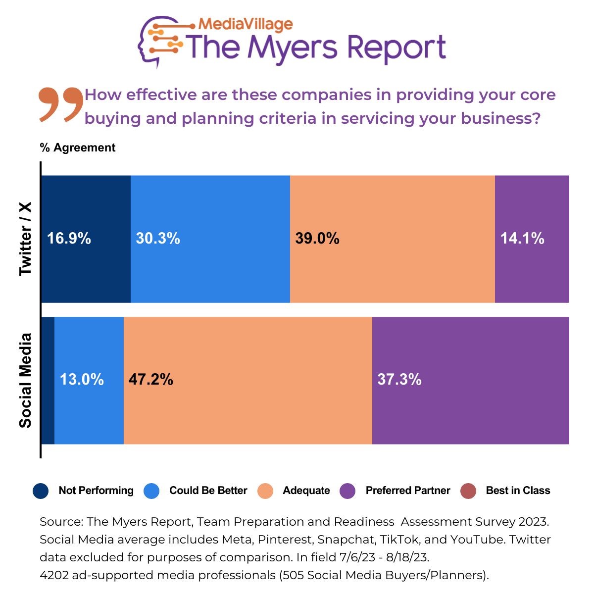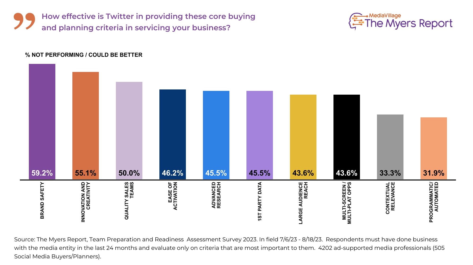 调查显示,47%的受访者认为,现在的“X”对营销人员来说“表现不佳”,或者“可以做得更好”。这与社交媒体行业15%的平均水平形成鲜明对比。表现不佳的三大原因分别是担心品牌安全(59%)、缺乏创新/创意机会(55%)和缺乏高质量的销售团队(50%)。