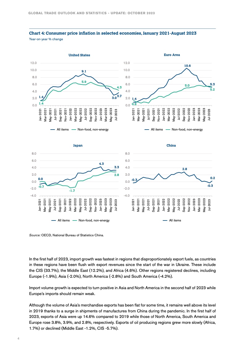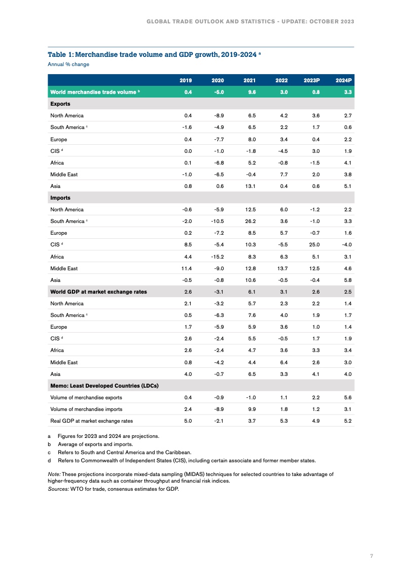 世贸组织同时预计,2024年全球商品贸易的增长率为3.3%,与之前的估计基本持平。按市场汇率计算,2023年全球实际国内生产总值将增长2.6%,2024年将增长2.5%。