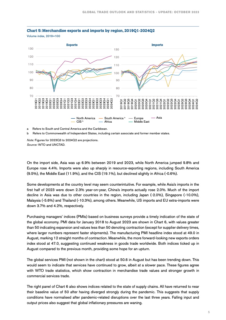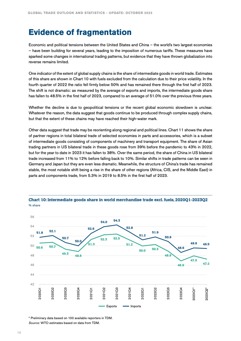 例如,作为全球供应链活动指标的中间产品在世界贸易中的份额在2023年上半年下降到48.5%,而前三年的平均值为51.0%。