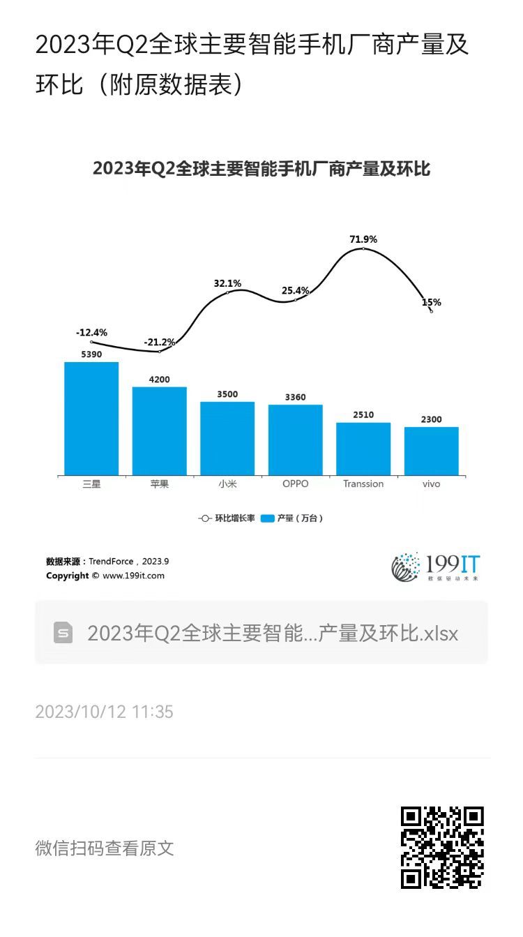 - 2023年Q3全球主要智能手机厂商产量及环比(附原数据表)