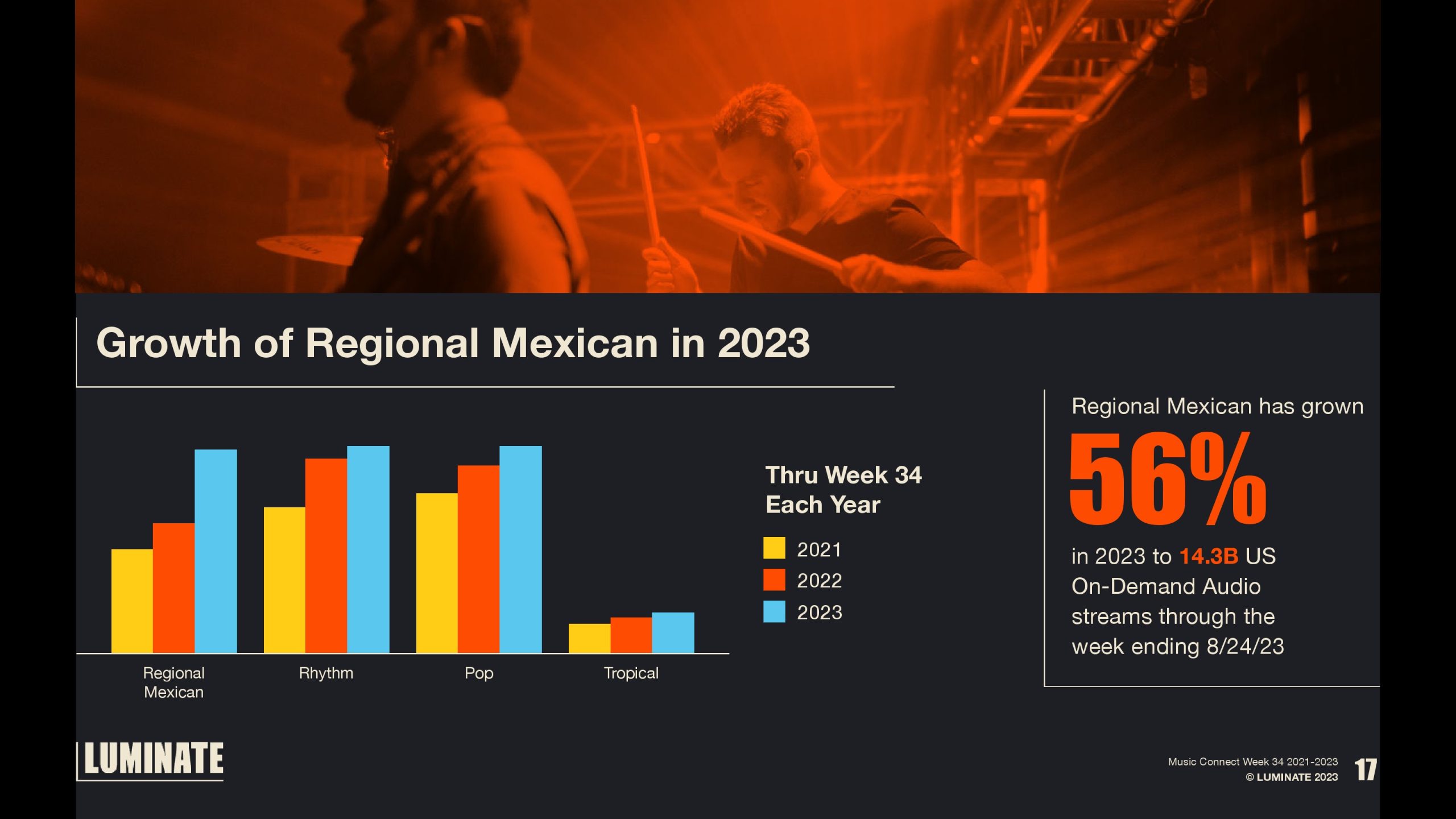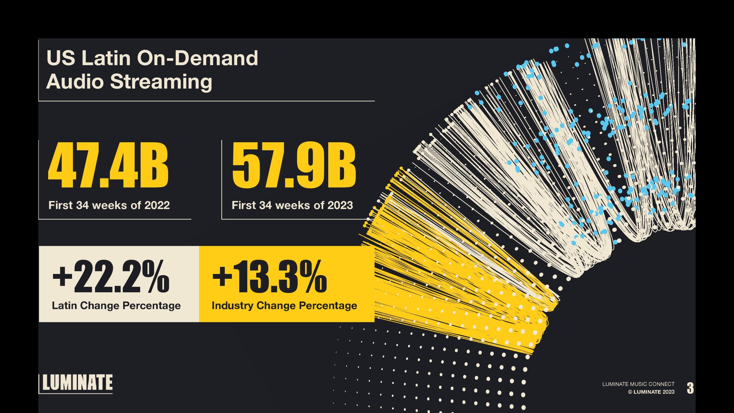 2022年的前34周,美国拉丁音乐点播音频流达到474亿次,2023年前34周达到579亿次。