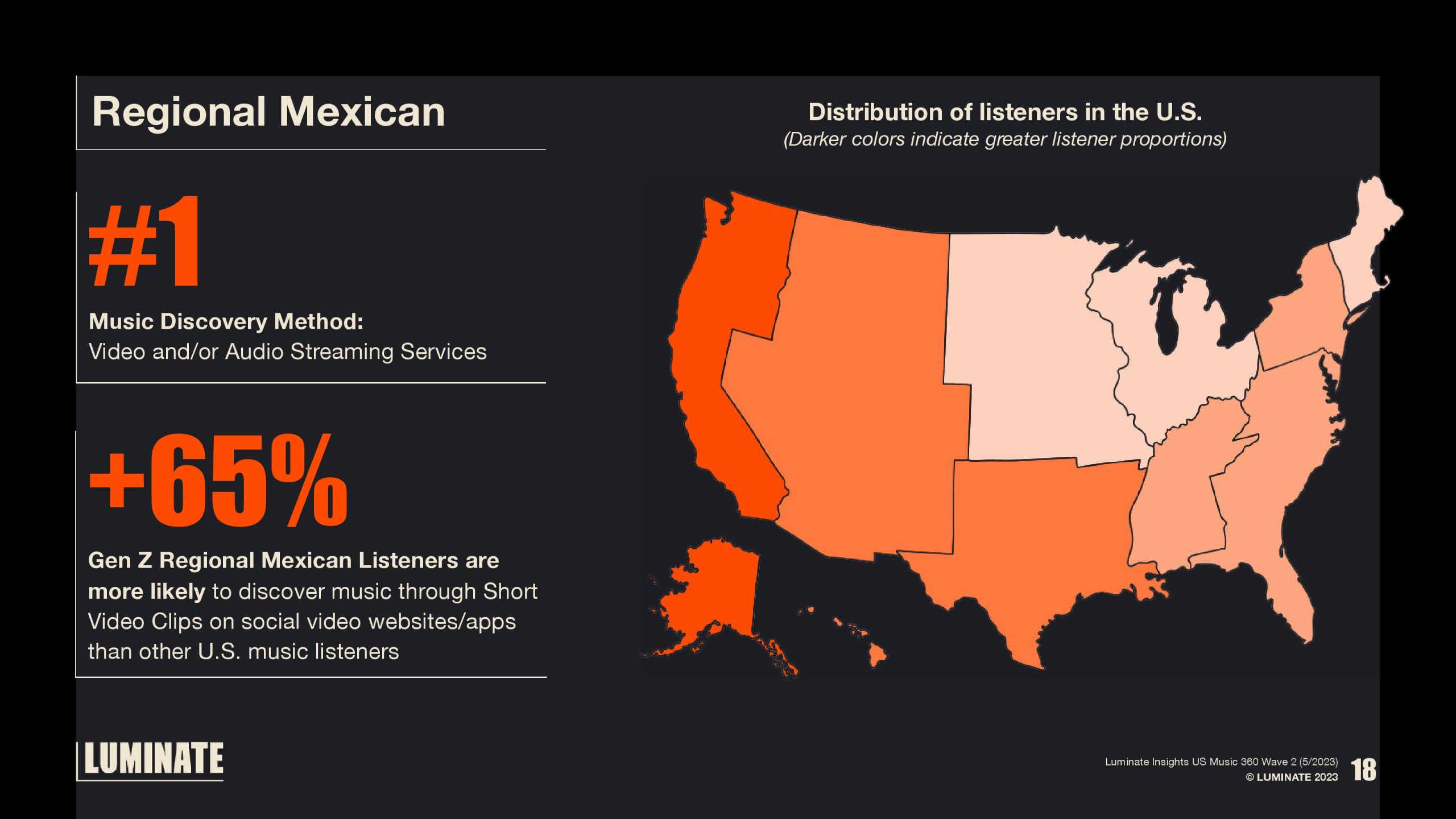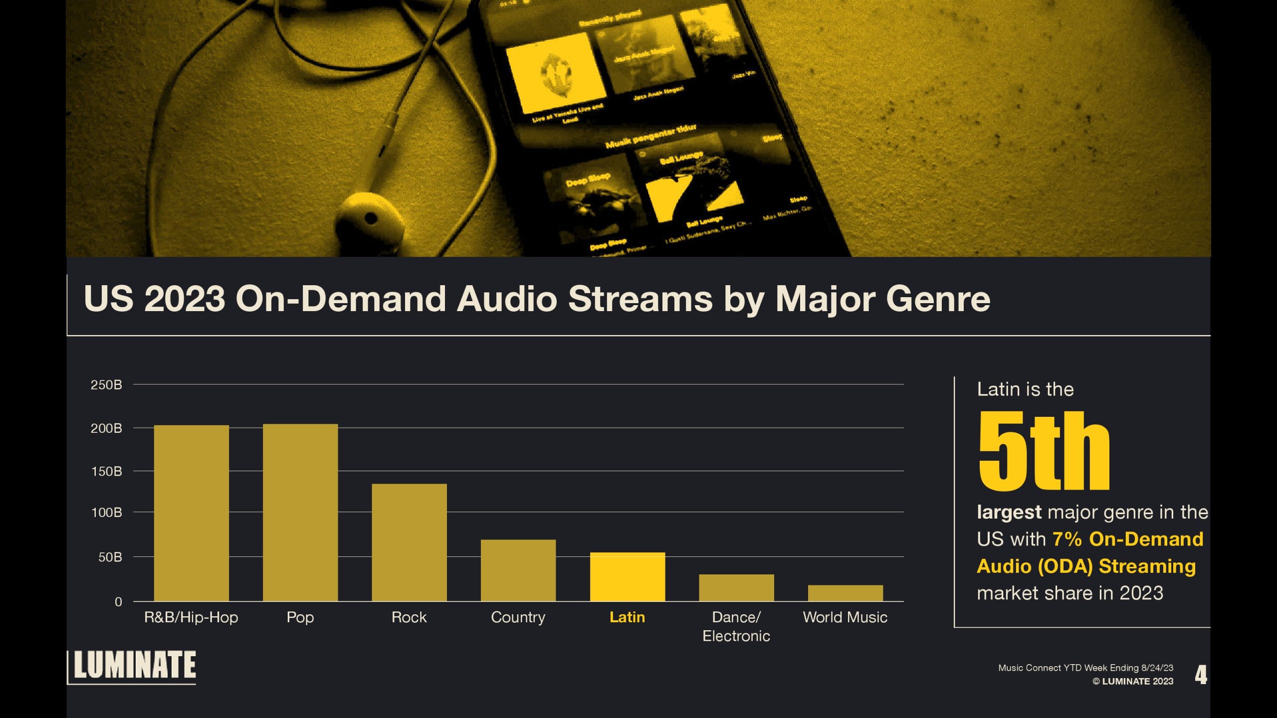 拉丁音乐是美国第五大主要音乐类型,到2023年将占7%的点播音频(ODA)流媒体市场份额。