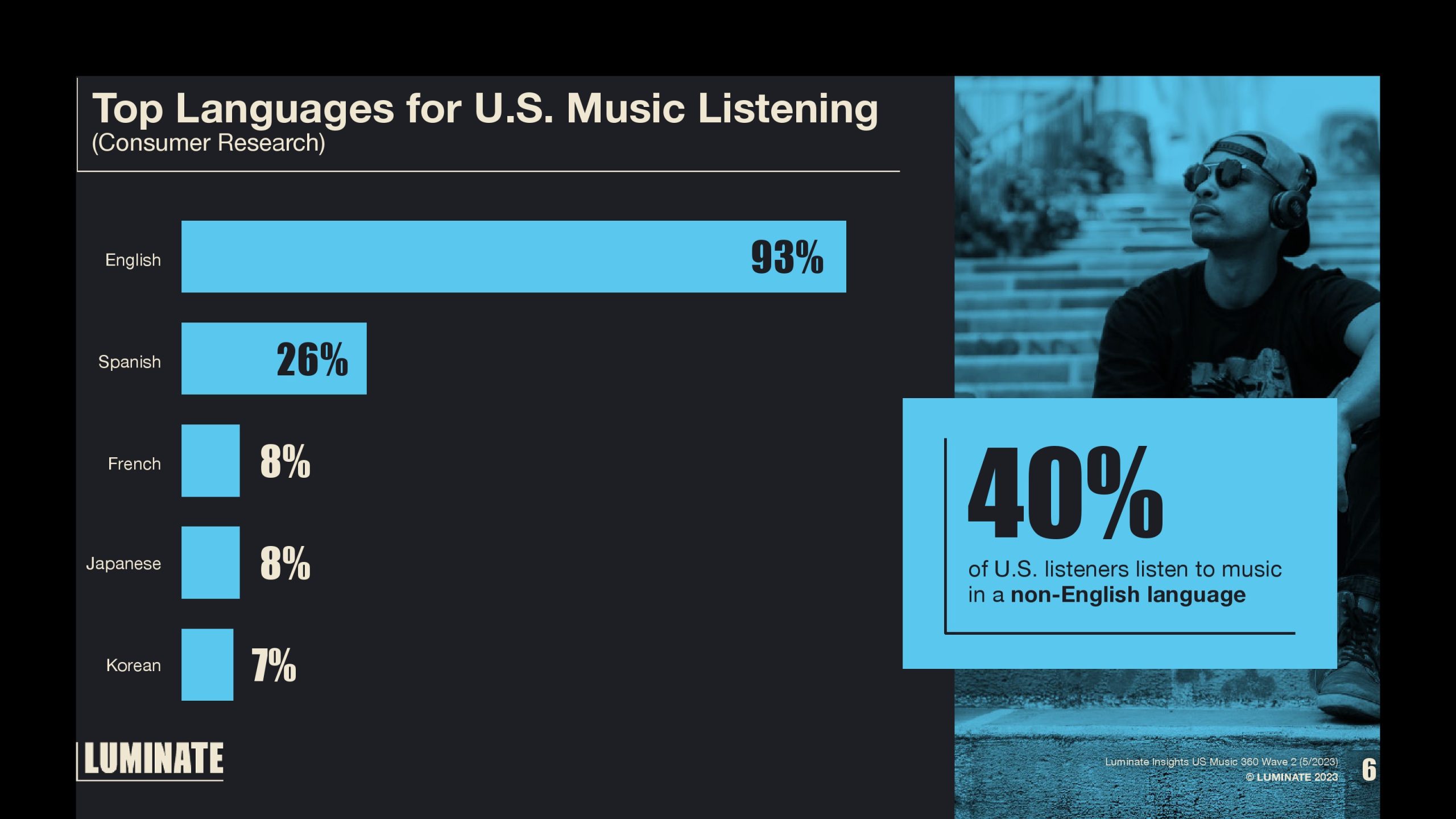 40%的美国音乐迷听非英语音乐。