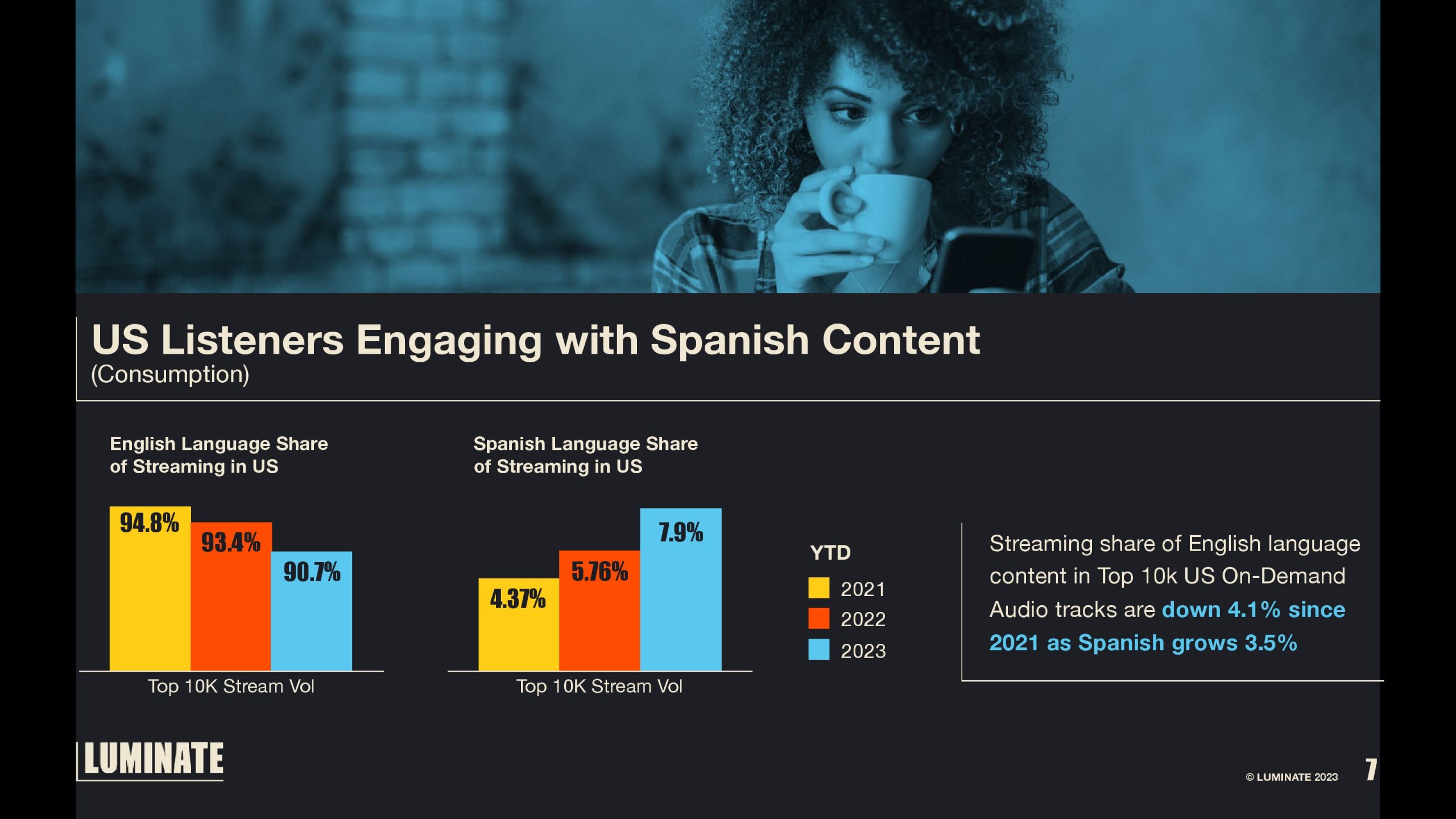 自2021年以来,美国前10万点播音频中英语内容的流媒体份额下降了4.1%,而西班牙语增长了3.5%。