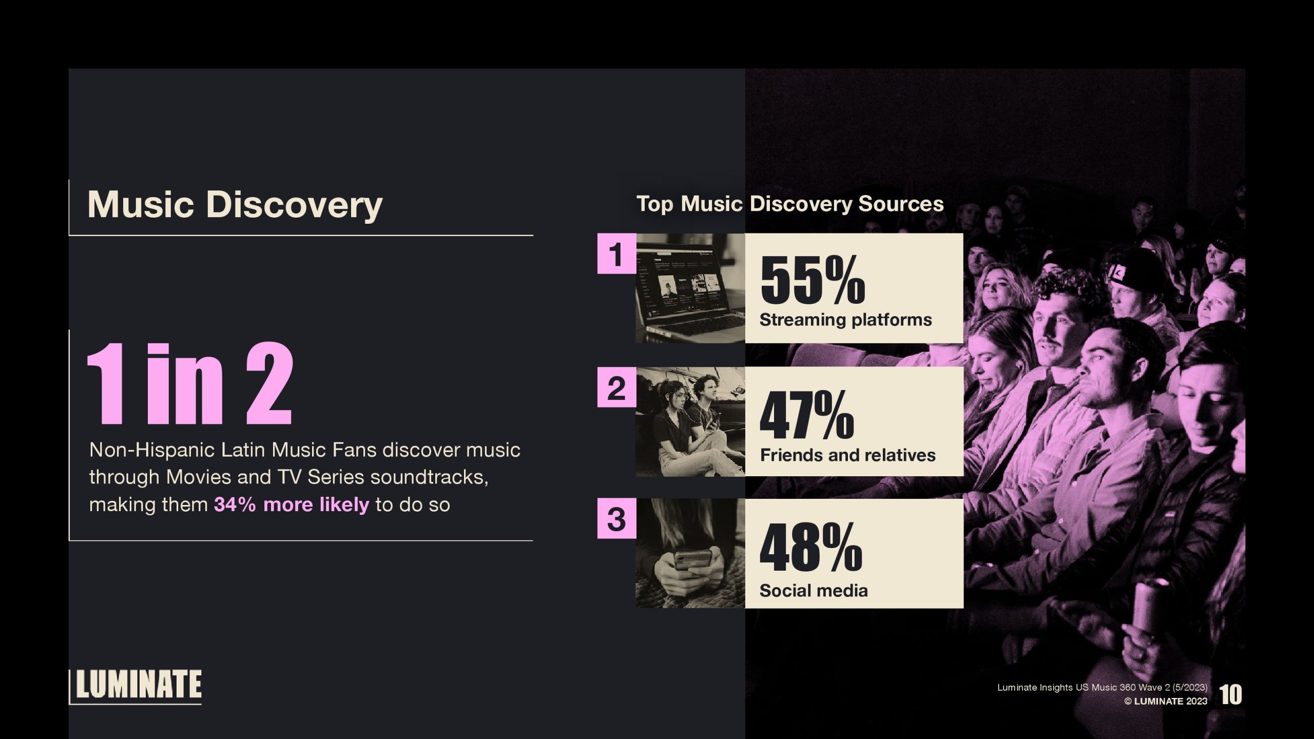 顶级音乐发现来源还包括流媒体平台(55%)、朋友和亲戚(47%)和社交媒体(48%)。