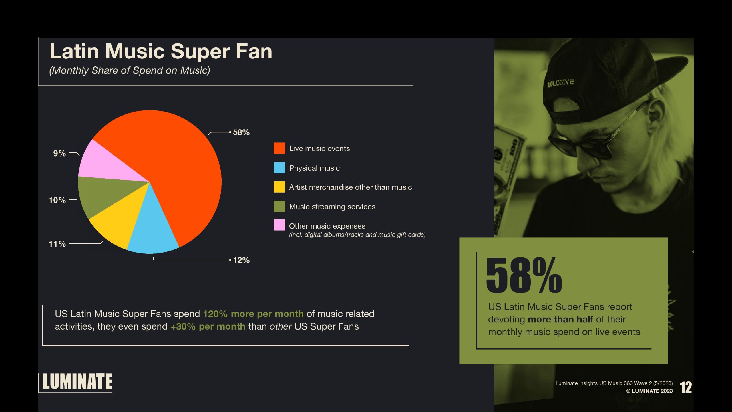 58%的美国拉丁音乐超级粉丝将超过一半的月度音乐支出用于现场活动。