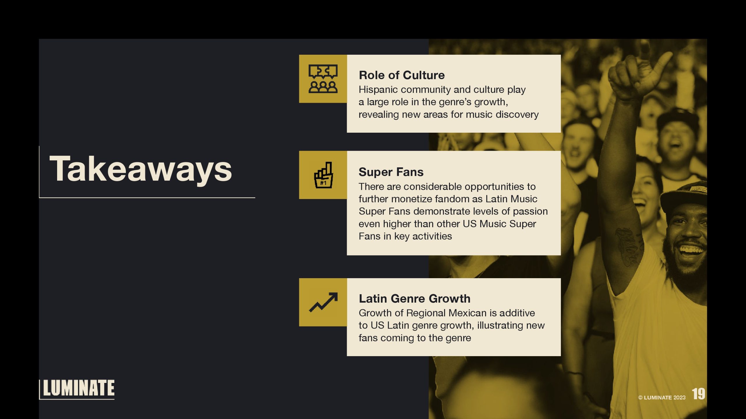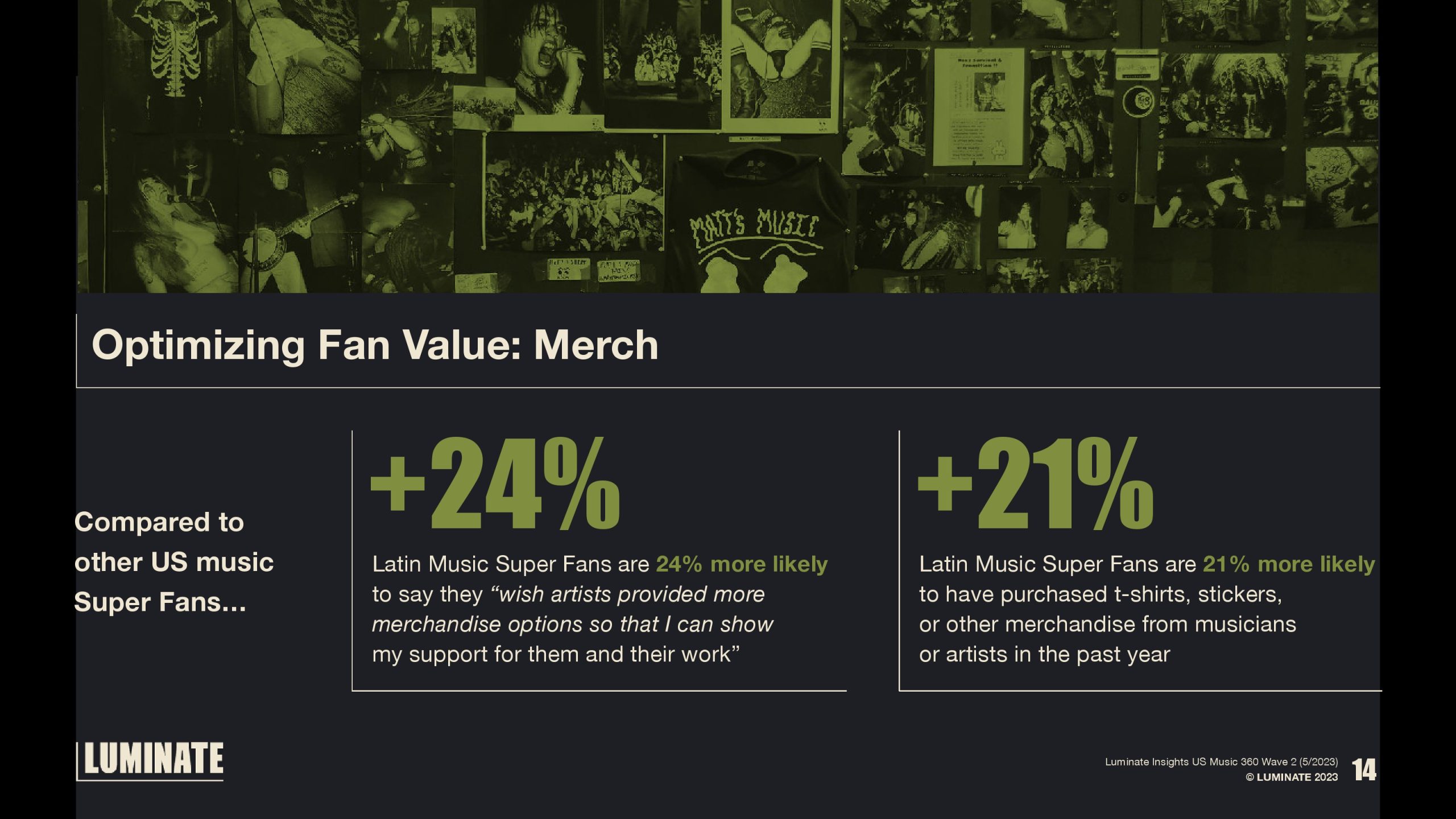 与其他美国音乐超级粉丝相比,拉丁音乐超级粉丝表示“希望艺人提供更多商品选择,这样我就可以表达对他们和他们作品的支持”的可能性要高出24%。拉丁音乐超级粉丝在过去一年中从音乐家或艺术家那里购买t恤、贴纸或其他商品的可能性高出21%。