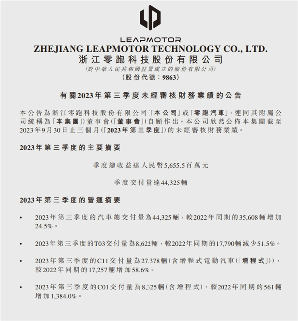 近日消息,零跑汽车公布了2023年Q3季度的财报。财报显示:本季度公司销售收入56.56亿元,同比增长31.9%,实现销量44325台,同比提升24.5%,双双创下季度新高。