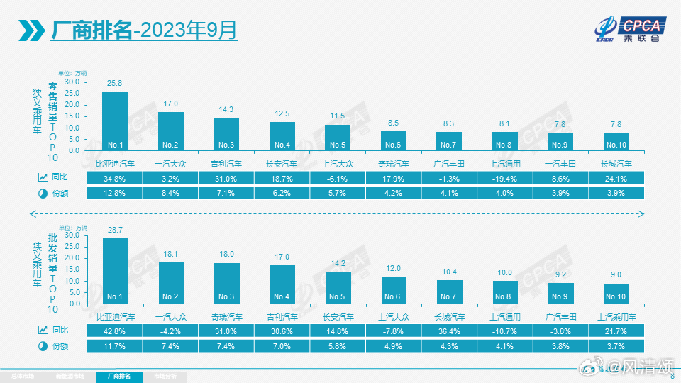 乘联会最新公布的批发销量数据,9月销量排名前十的车企中有六家为自主车企。具体来看,批发销量排名第一的为比亚迪,单月销量28.7万辆,远远领先第二名一汽大众的18.1万辆。