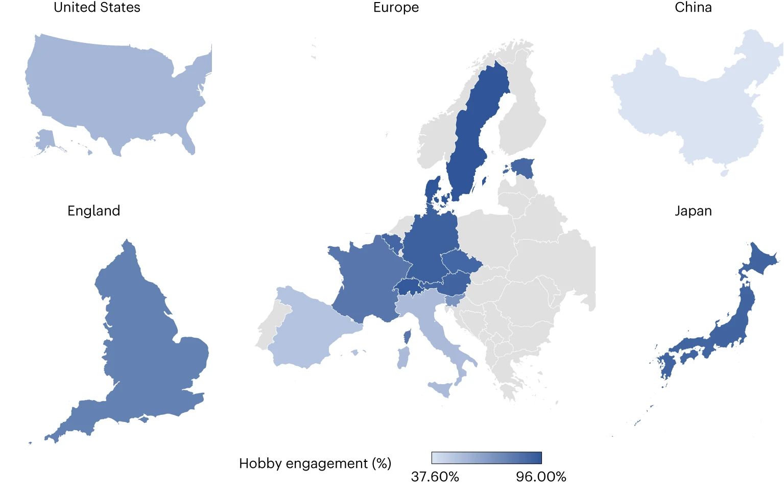研究人员发现,不同国家表示自己有爱好的人比例差异很大,西班牙 51% 的研究参与者表示自己有爱好,而丹麦的这一比例为 96%,瑞典为 95.8%,瑞士为 94.4%。
