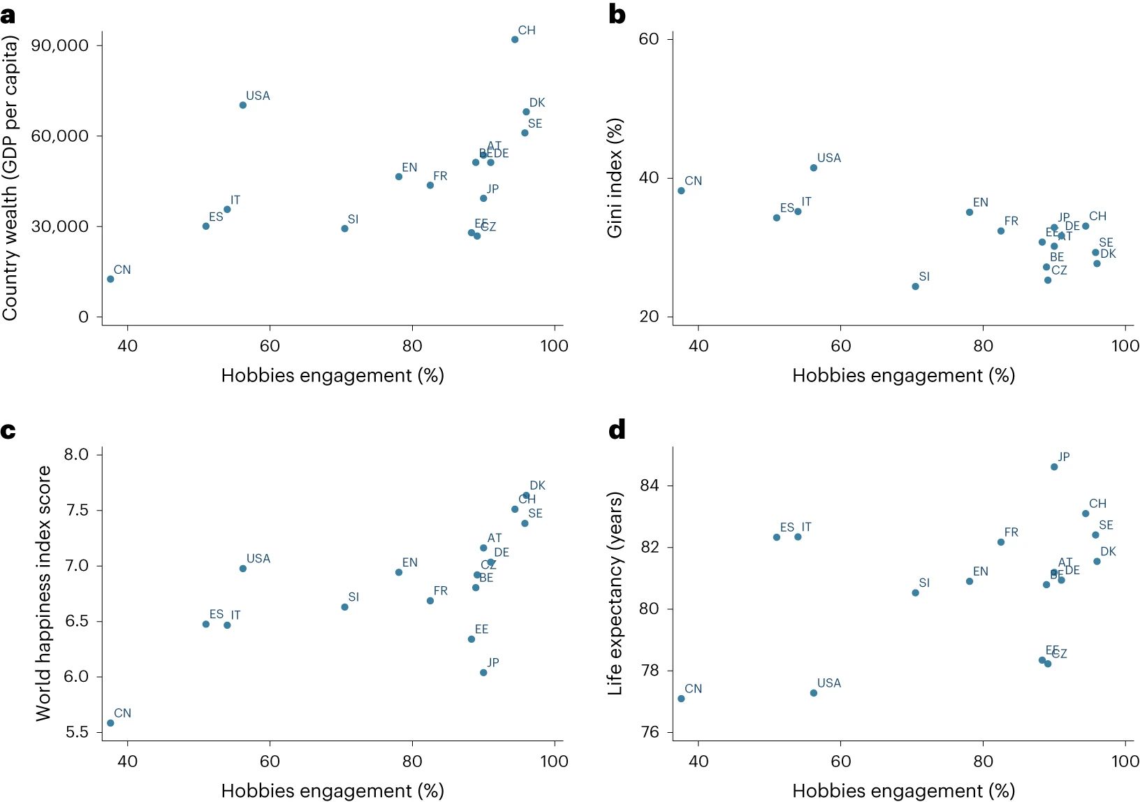 在调整伴侣关系状况、就业和家庭收入等其他因素后,这些结果仍然存在。研究发现,拥有一项爱好的好处是相对普遍的,各国之间只有很小的差异。