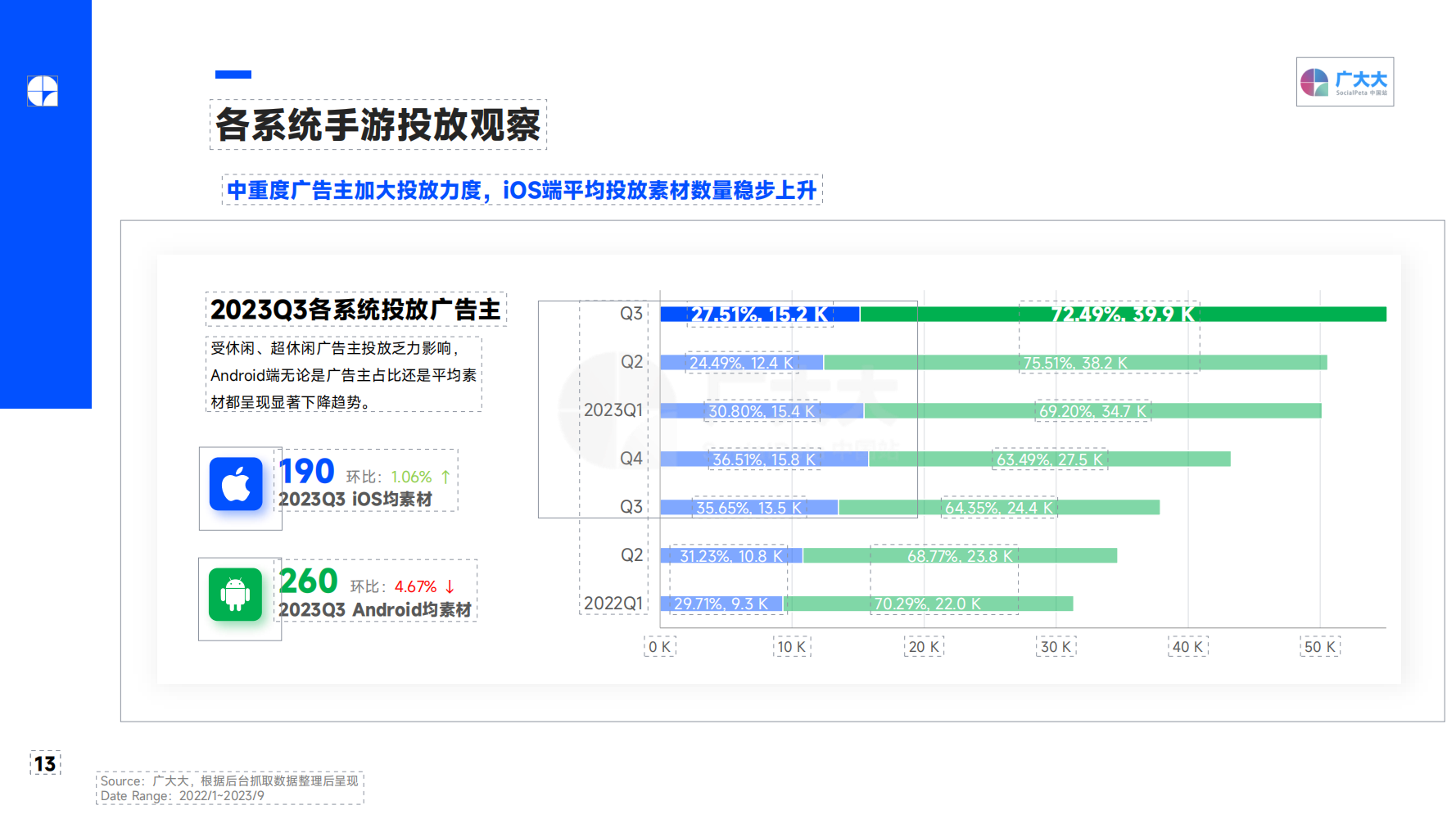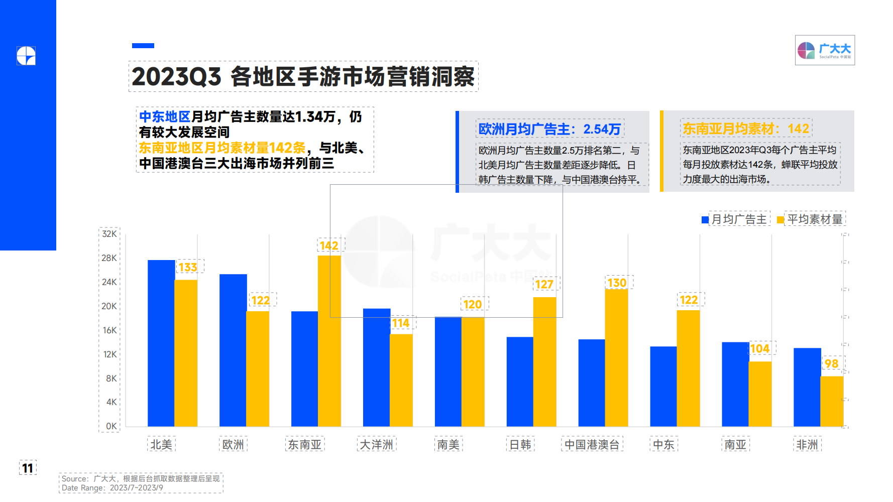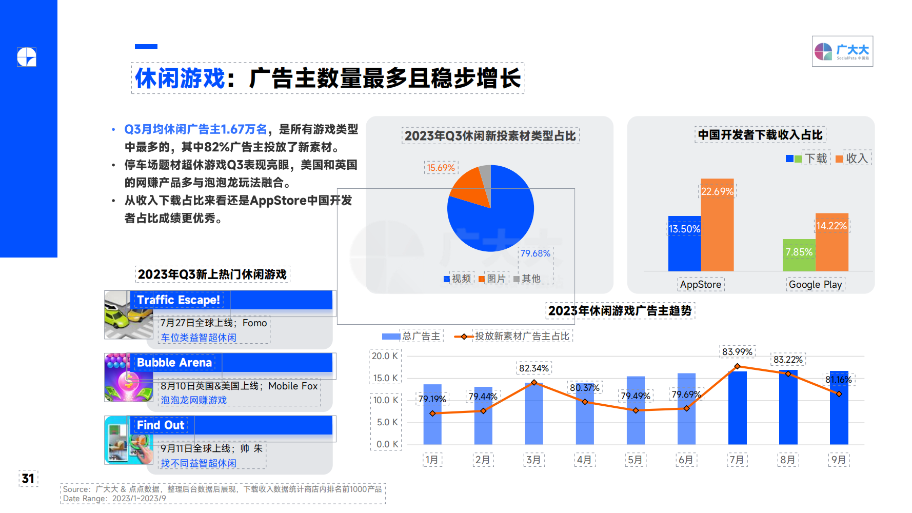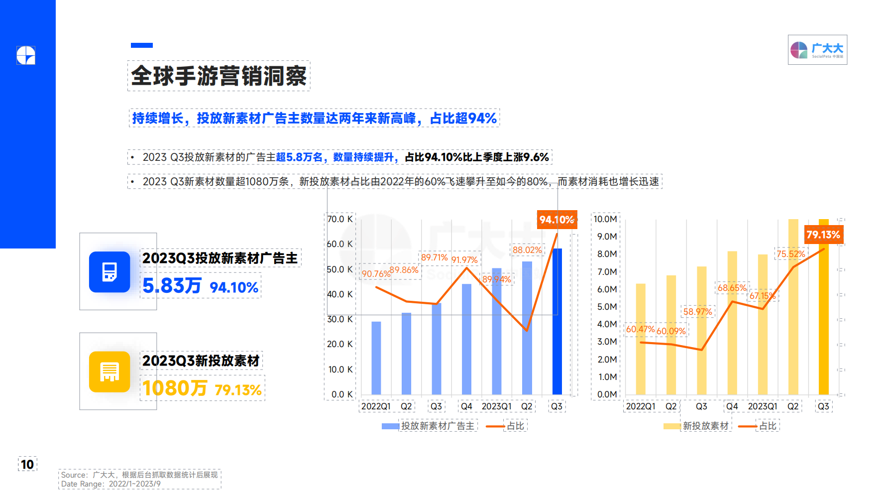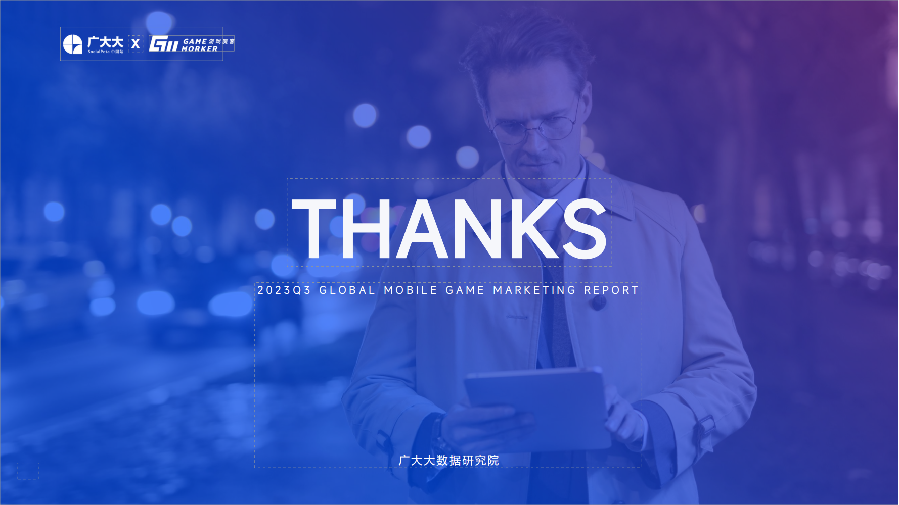 为此,广大大数据研究院联合游戏魔客共同发布《2023Q3 全球移动游戏营销趋势洞察》报告,报告中将深入分析2023年第三季度移动游戏市场的核心动态,从投放买量、素材风向、出海厂商下载/收入占比、新游营销回盘等方面对于游戏市场进行系统性地分析与归因,为游戏开发者、素材优化师、游戏厂商们提供最新最全的出海游戏营销地图。